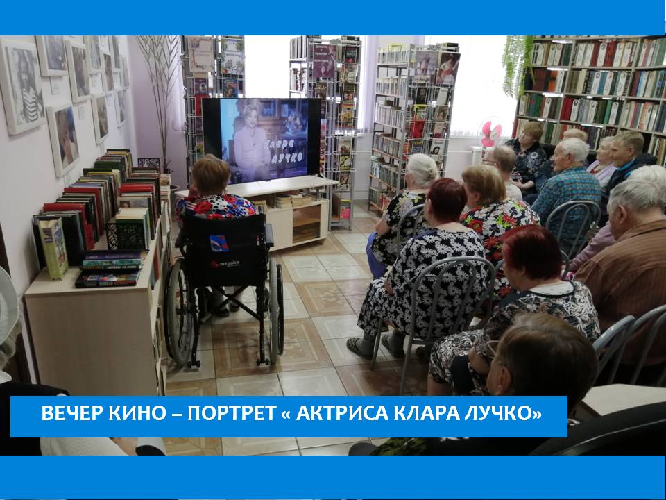 1 июля любителей кино  в библиотеке ждала  встреча с жизнью и творчеством известной киноактрисы Клары Лучко. Красивая, обаятельная, остроумная,  она  сыграла в десятках фильмов, которые полюбили миллионы зрителей. Сегодня, когда смотришь фильмы с ее участием, убеждаешься в ее профессиональной добросовестности, величайшем мастерстве и таланте. Об этом и шла  речь на данном мероприятии. На вечере посмотрели кадры из фильмов с ее участием: «Кубанские казаки», «Двенадцатая ночь», киноповесть «Цыган» и другие, а  в  рамках клуба документального кино,   фильм  «Память сердца. Клара Лучко».