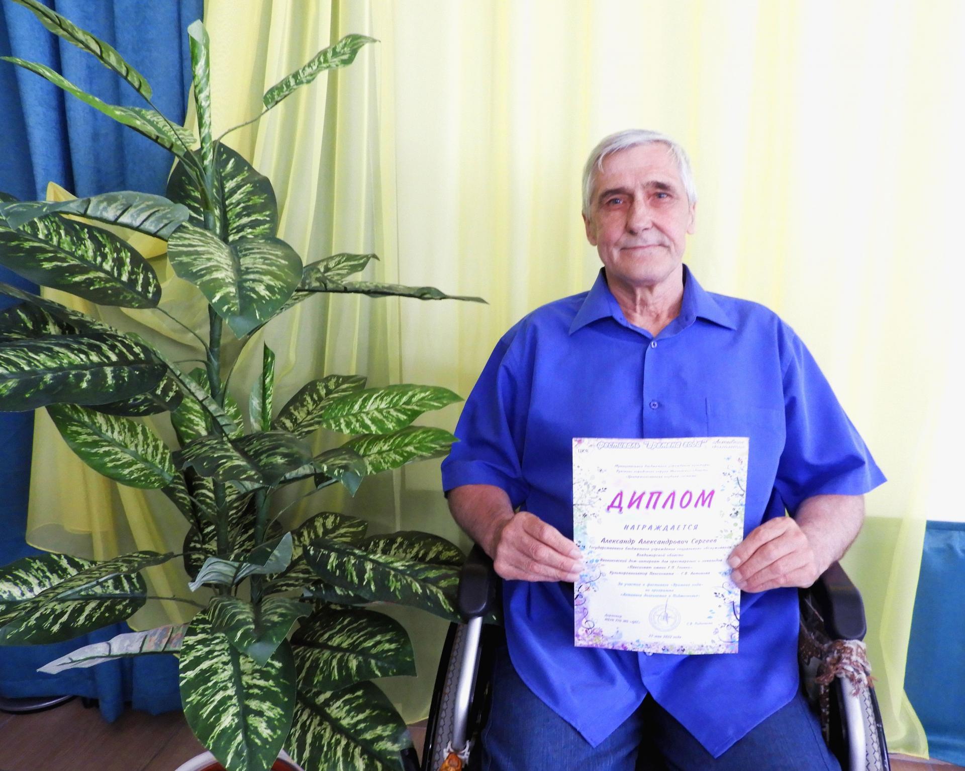В рамках программы «Активное долголетие», Вязниковский Пансионат принял участие в сетевом фестивале «Времена года», организатором которого является МБУК Рузского городского округа Московской области «Централизованная клубная система». Основная цель фестиваля – выявление творческого потенциала среди людей пожилого возраста. Фестиваль проводится в режиме нон-стоп и подразделяется на времена года. Итог подводится после окончания каждого сезона. Первый этап был посвящён весне – «Весеннее настроение». Житель Пансионата Александр Александрович Сергеев награждён дипломом за участие в номинации «Художественное слово» со стихотворением С. Есенина «Черёмуха».