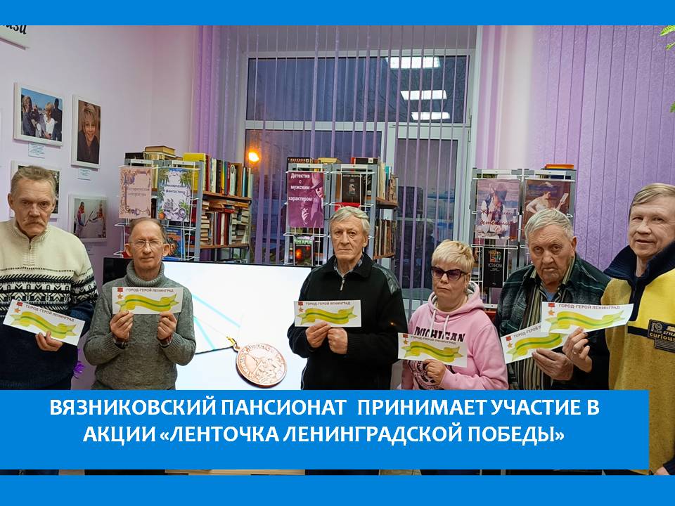 К 80-летию снятия блокады Ленинграда по всей стране проходит Акция «Ленточка Ленинградской победы». К дате 65 лет снятия блокады Ленинграда был создан этот символ, связанный с конкретным днем истории Отечества. Цвета ленточки заимствовали с ленты колодки медали «За оборону Ленинграда». Жители пансионата принимают участие в различных меропиятиях к 80-летию снятия блокады Ленинграда, тем самым поддерживая эту акцию. В библиотеке, в рамках клуба документального кино был показан документальный фильм «Неизвестные страницы блокады Ленинграда 1941-1944 год», как ученые и инженеры спасали блокадный Ленинград. Благодаря их уникальным разработкам удалось избежать еще больших разрушений и сохранить многие жизни.