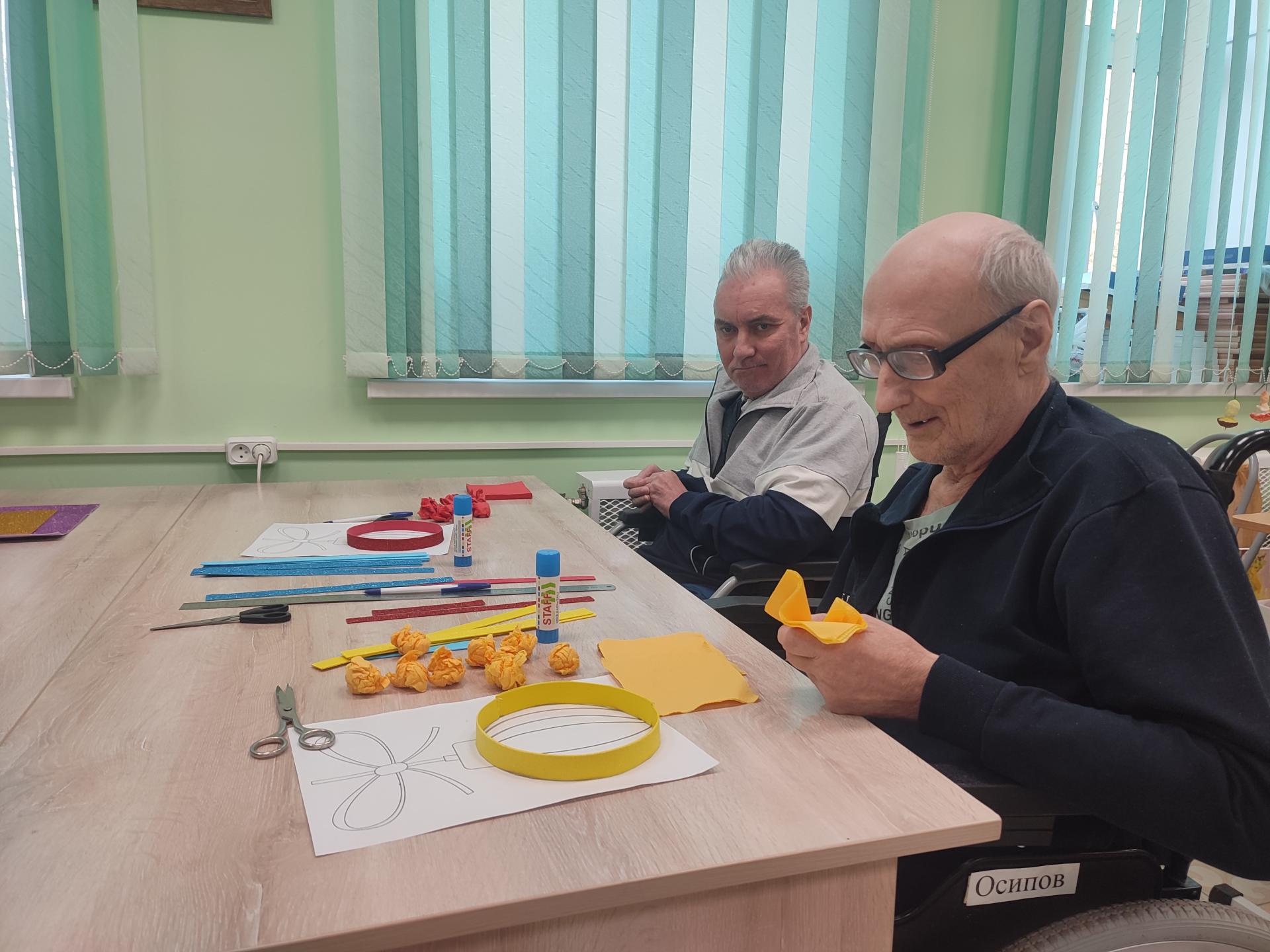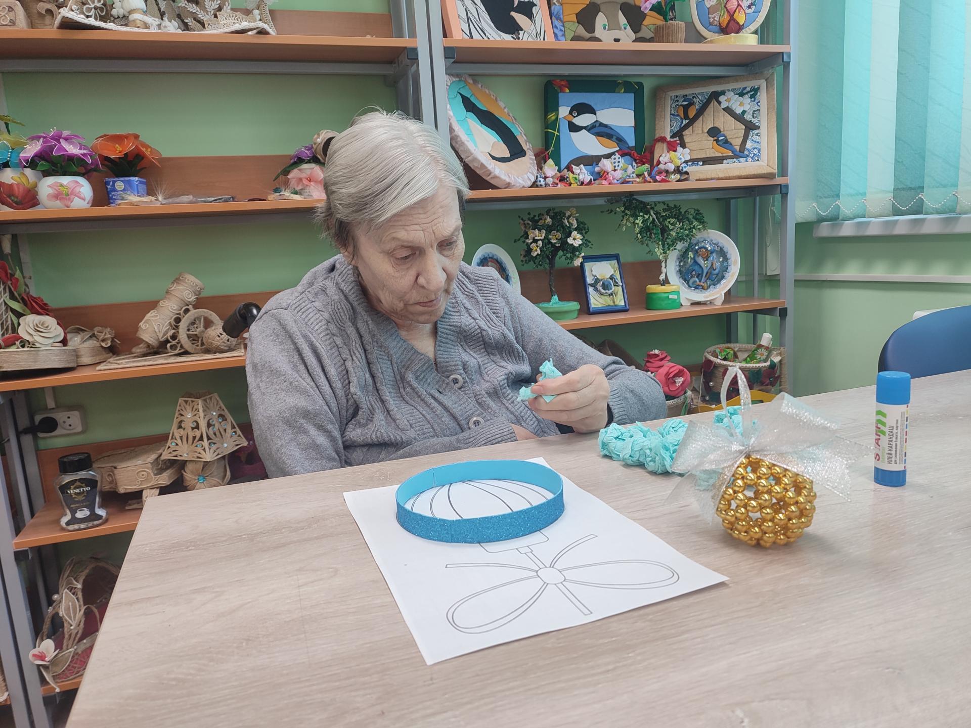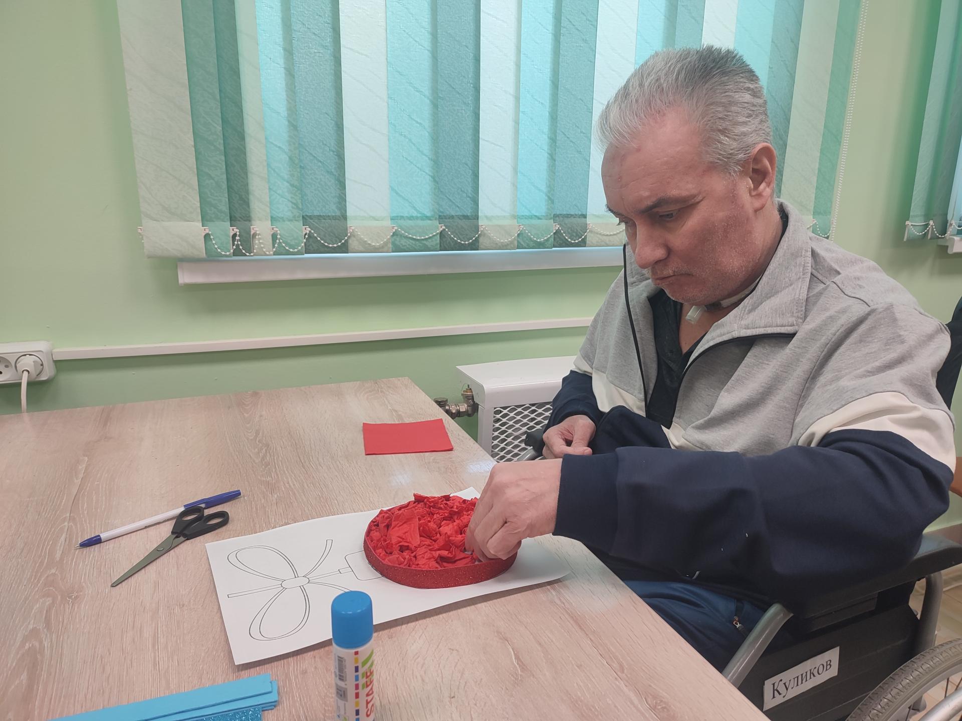 В преддверии Нового года все занятия в мастерской, так или иначе, приурочены к главному новогоднему празднику. Сегодня, например, маломобильные жители Пансионата на трудовом реабилитационном занятии изготавливали яркие аппликации из салфеток.