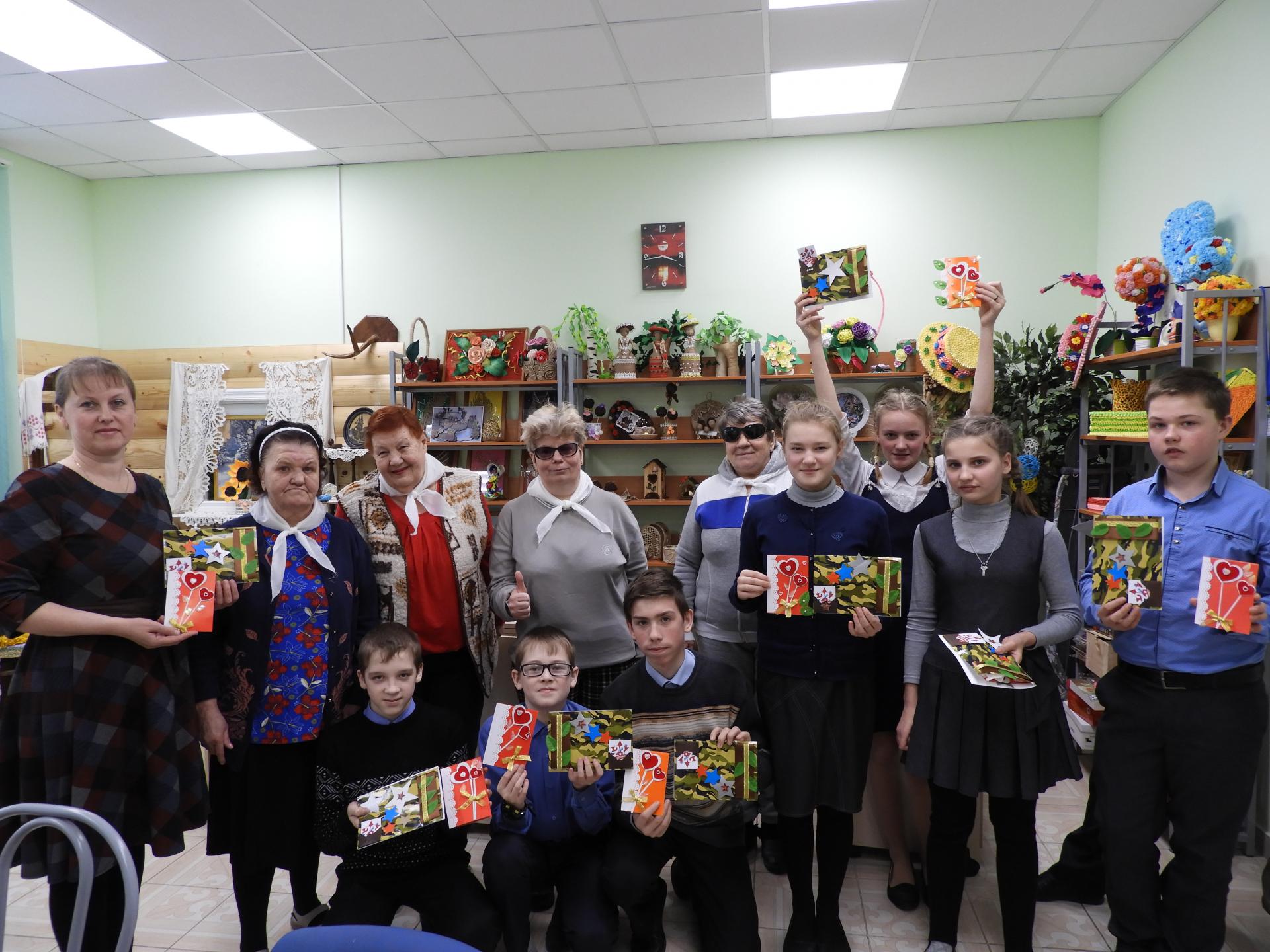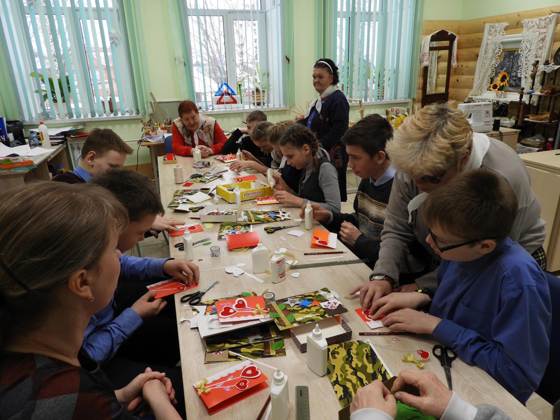 Мастер-класс можно назвать двойным, потому что за одно занятие ребята успели сделать сразу по две открытки. Одна открытка была посвящена Дню защитника Отечества, а открытку-валентинку, посвященную Дню влюбленных, ребята делали по желанию, но желающих оказалось много. Поэтому с мастер-класса все ребята ушли счастливые и с двумя авторскими открытками.
