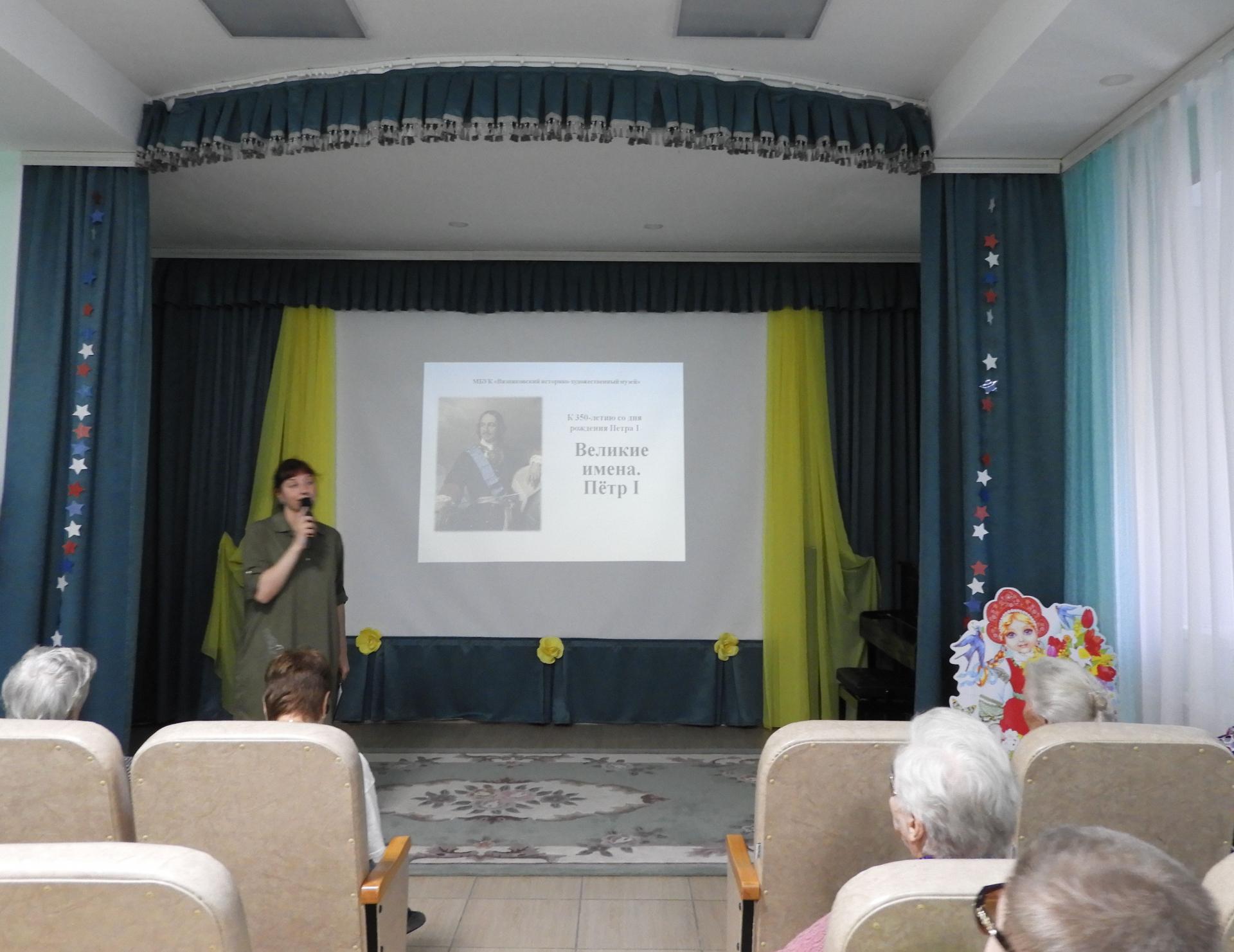 В рамках плана мероприятий, посвящённых Дню России, в Вязниковском Пансионате прошёл исторический час, темой которого стало 350-летие со дня рождения Первого Всероссийского императора Петра I. Час истории был проведён экскурсоводом Вязниковского историко-художественного музея. Вместе с сотрудником музея, зрители вспоминали выдающегося монарха, сумевшего произвести глубочайшие преобразования в российском государстве. За период его правления страна вошла в число передовых европейских держав и обрела статус империи. Рассказ сопровождался презентацией, в которой наглядно были представлены основные реформы Петра I. Жители Пансионата с большим интересом слушали экскурсовода, а по завершению исторического часа пригласили ещё с подобным мероприятием.