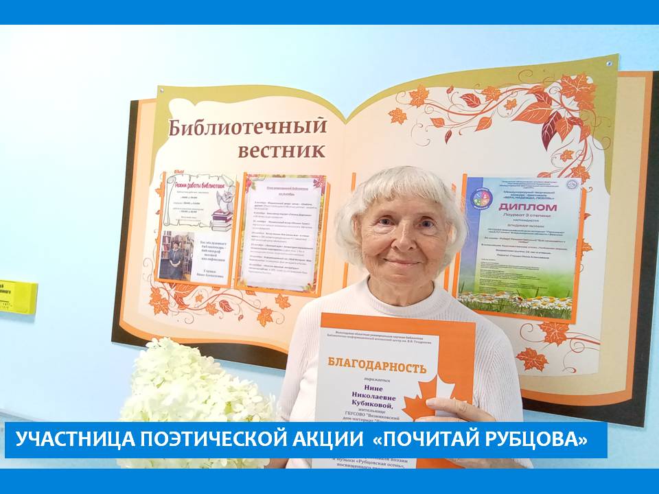 К участию онлайн пригласили всех желающих, любителей и ценителей поэзии Николая Рубцова. Жительница пансионата Кубикова Нина Николаевна приняла участие в поэтической акции и прочитала стихотворение Н.Рубцова «Далёкое». Она получила благодарность от организаторов с традиционным фирменным логотипом. Ссылка https://vk.com/bibliogurman