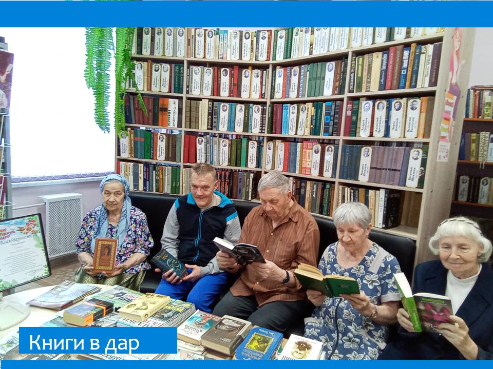 Волонтеры владимирского сообщества "Инициатива" пополнили книжный фонд библиотеки пансионата. Даритель - это особое свойство души, это щедрость и бескорыстие. Библиотека с удовольствием принимает книги в дар, а жители пансионата искренне благодарят тех, благодаря кому фонд пополнился интересными изданиями.