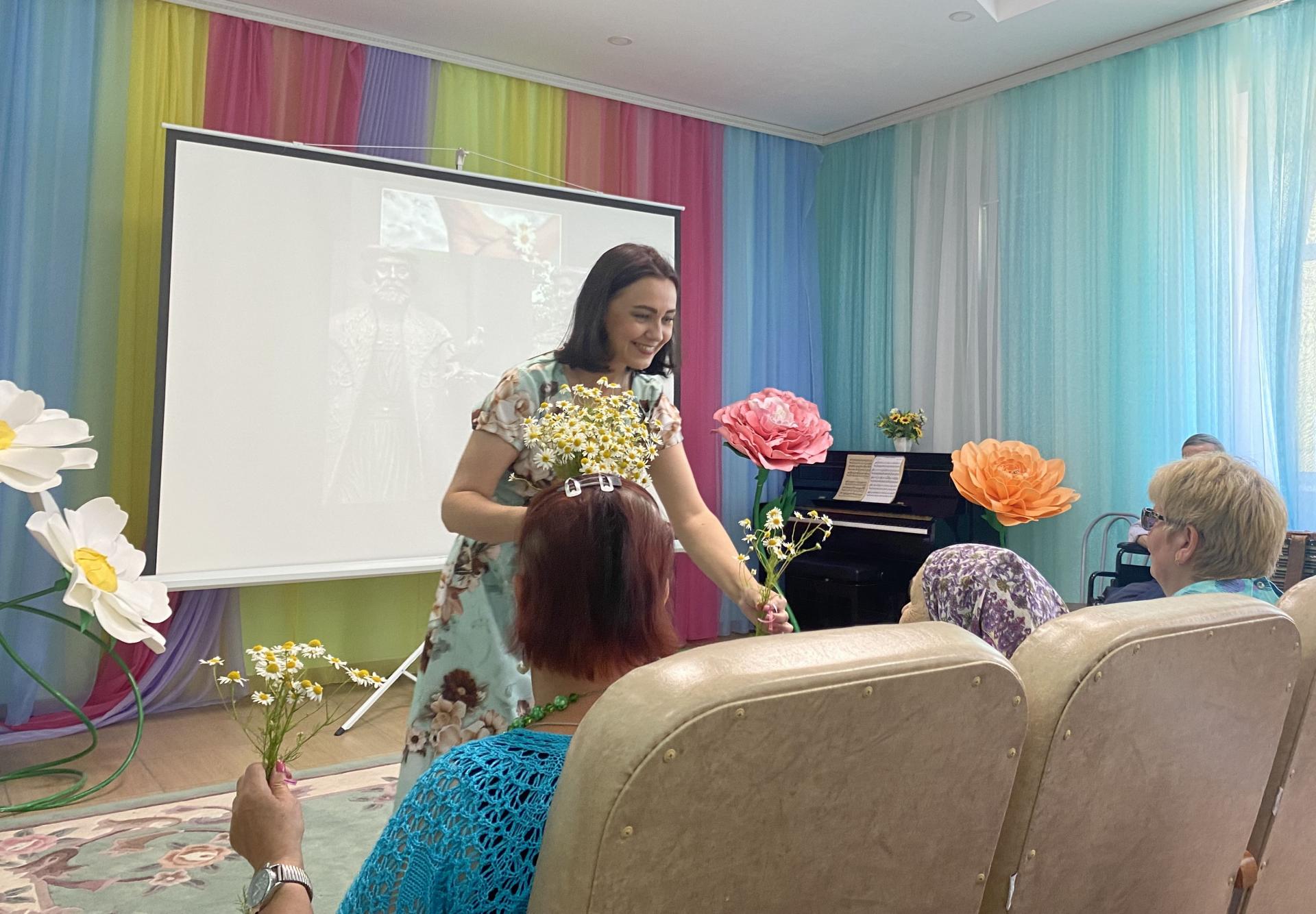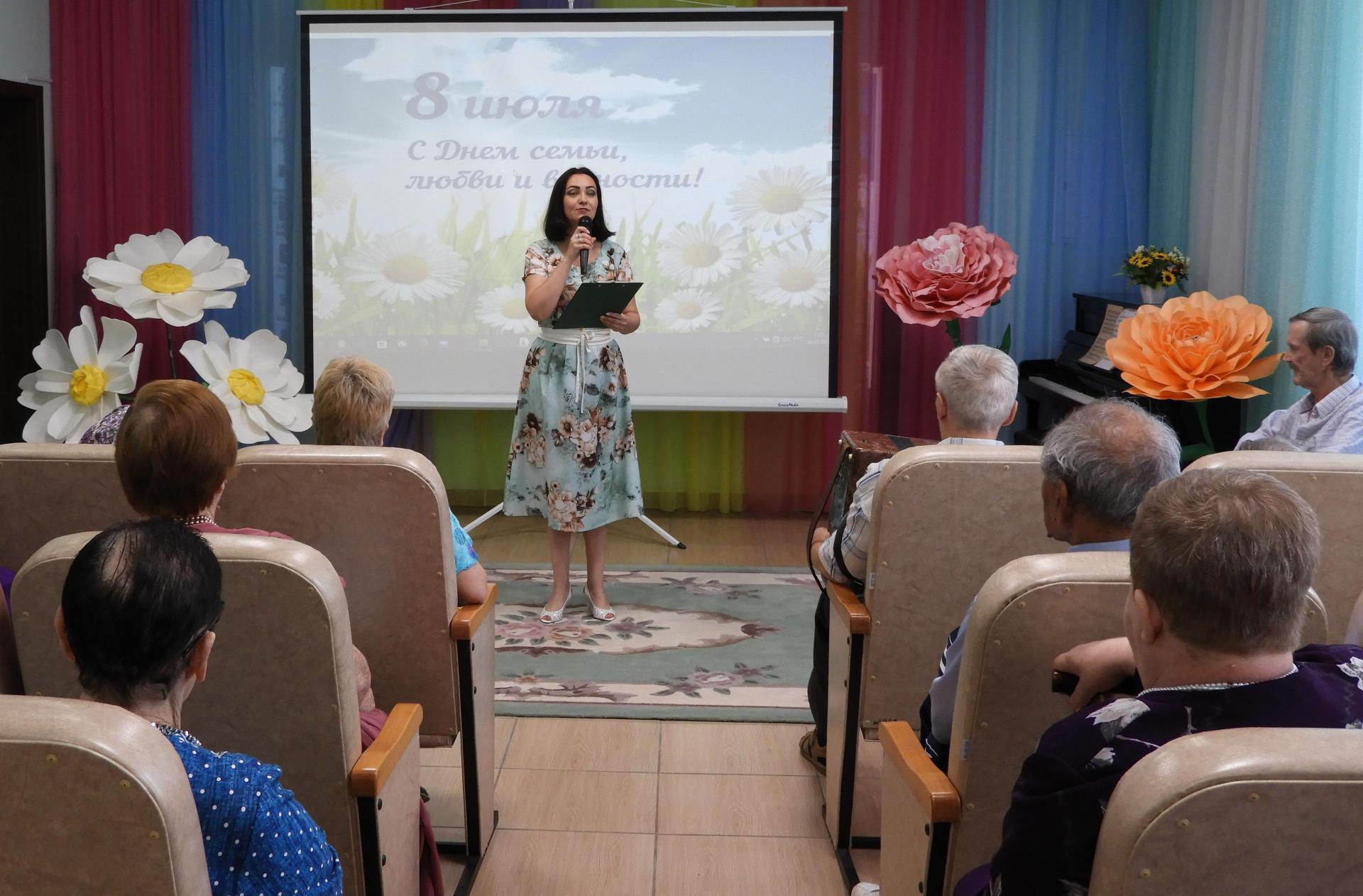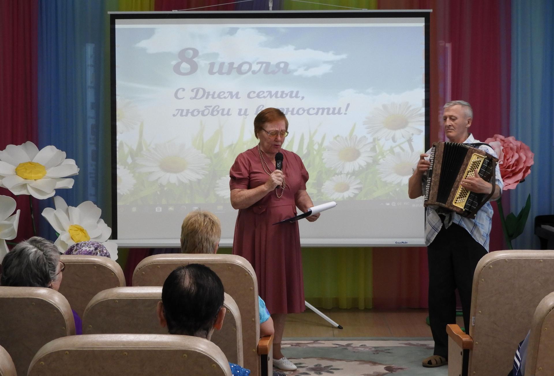 Отметить этот прекрасный праздник решили концертной программой, подготовленной серебряными волонтёрами Пансионата. В ходе мероприятия вспомнили историю и традиции праздника, пословицы и поговорки о семье, приняли участие в викторинах «Родня» и «Цветы в песнях». Стихи о любви перекликались с песнями, которые подхватывались всем залом «Что так сердце растревожено», «А он мне нравится», «Яблоневый вечер», «Родительский дом», «Ягода-малина» и др. Семейным парам Пансионата вручили тематический фотоколлаж с их фотографиями, а в завершении концерта всем женщинам – букетик ромашек.