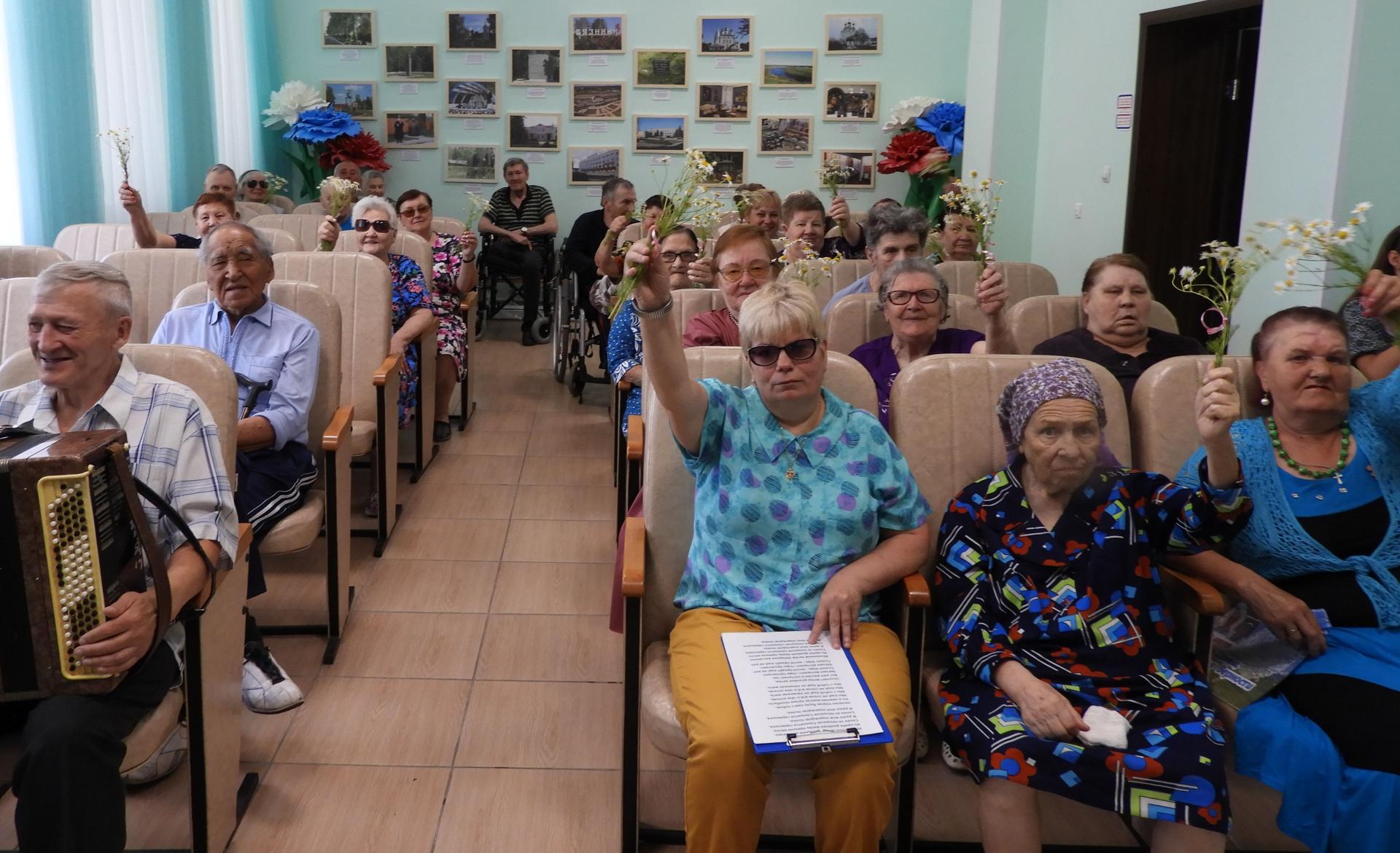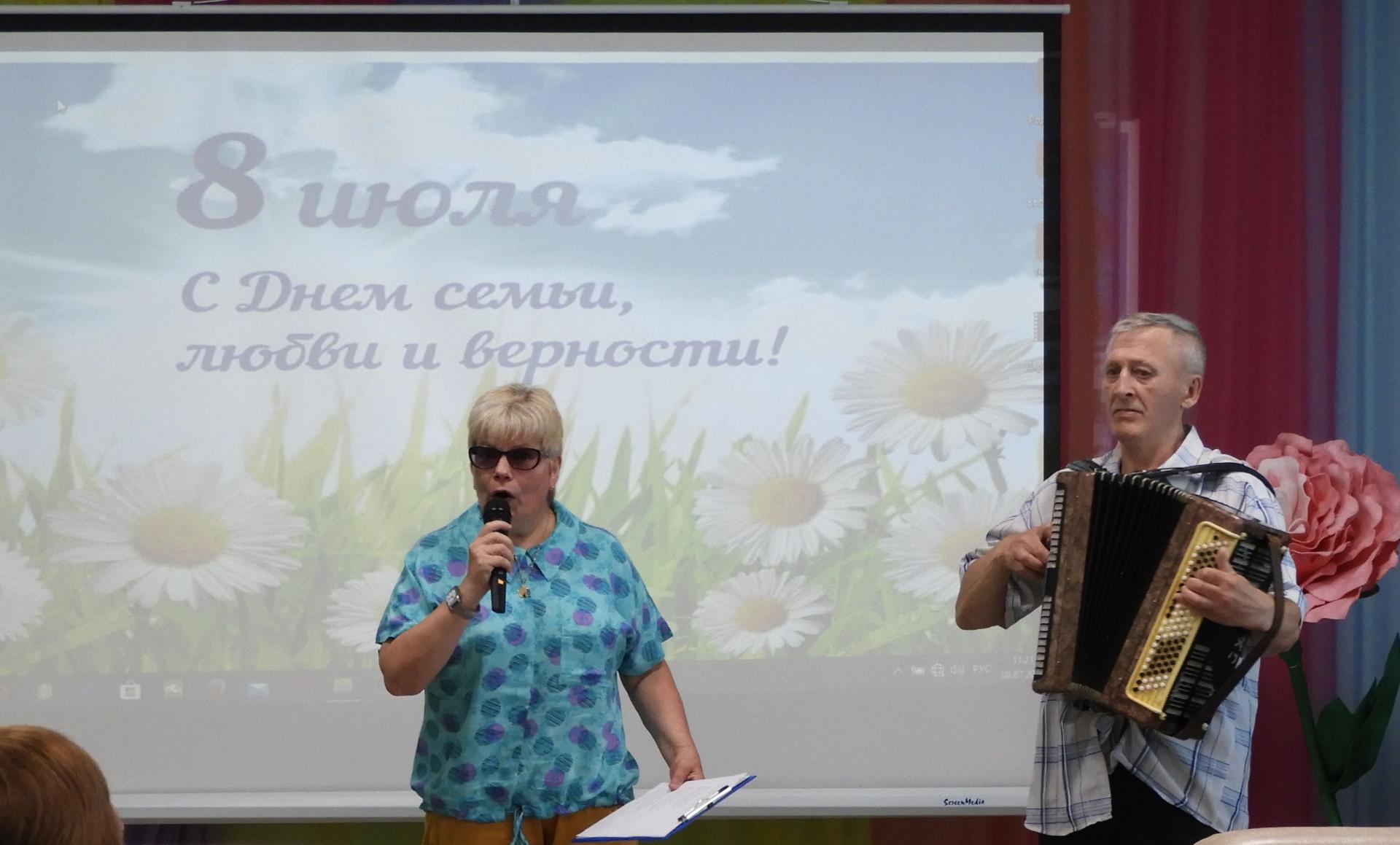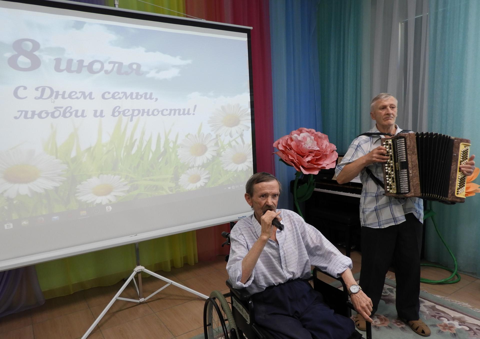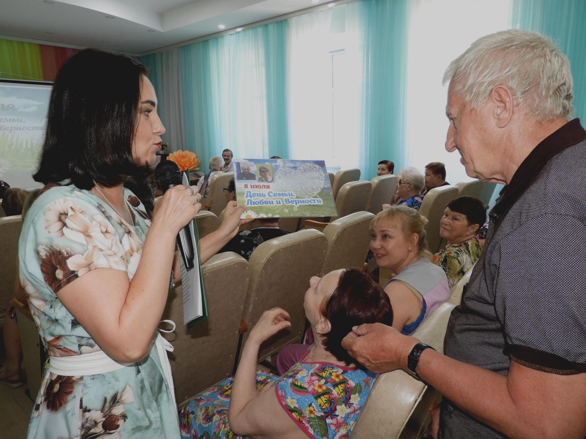 Отметить этот прекрасный праздник решили концертной программой, подготовленной серебряными волонтёрами Пансионата. В ходе мероприятия вспомнили историю и традиции праздника, пословицы и поговорки о семье, приняли участие в викторинах «Родня» и «Цветы в песнях». Стихи о любви перекликались с песнями, которые подхватывались всем залом «Что так сердце растревожено», «А он мне нравится», «Яблоневый вечер», «Родительский дом», «Ягода-малина» и др. Семейным парам Пансионата вручили тематический фотоколлаж с их фотографиями, а в завершении концерта всем женщинам – букетик ромашек.