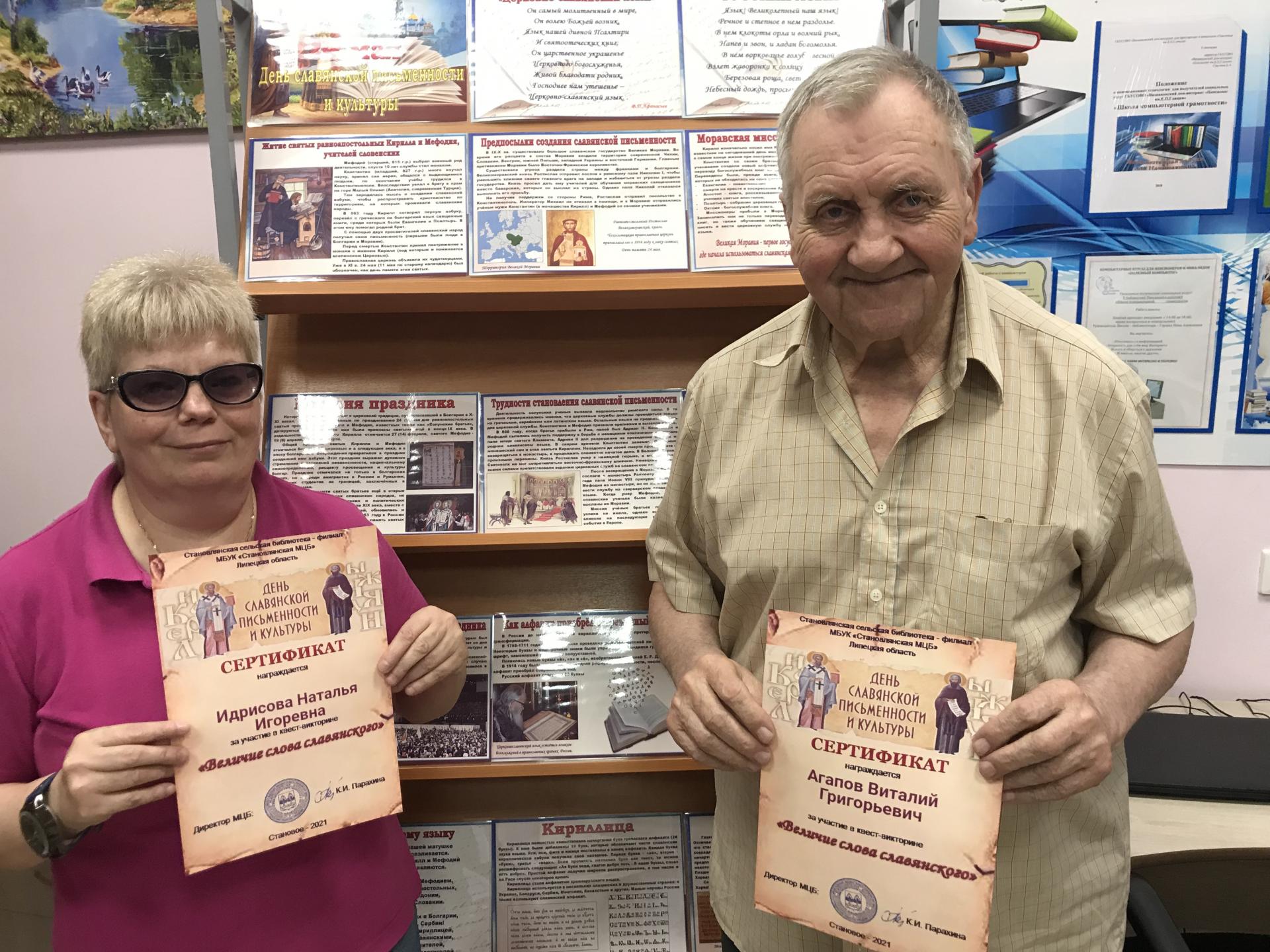 24 мая отмечается День славянской письменности и культуры – праздник, неразрывно связанный с именами двух христианских святых равноапостольных Кирилла и Мефодия. Братья внесли огромный вклад в развитие славянского общества, его культуры. Жители Пансионата Идрисова Наталья Игоревна и Агапов Виталий Григорьевич приняли участие в квест-викторине «Величие слова славянского», посвящённой истории Дня славянской письменности и культуры, возникновении письменности на Руси и развитии русской азбуки. Отвечая на вопросы они проверили свои знания и получили сертификат за участие!