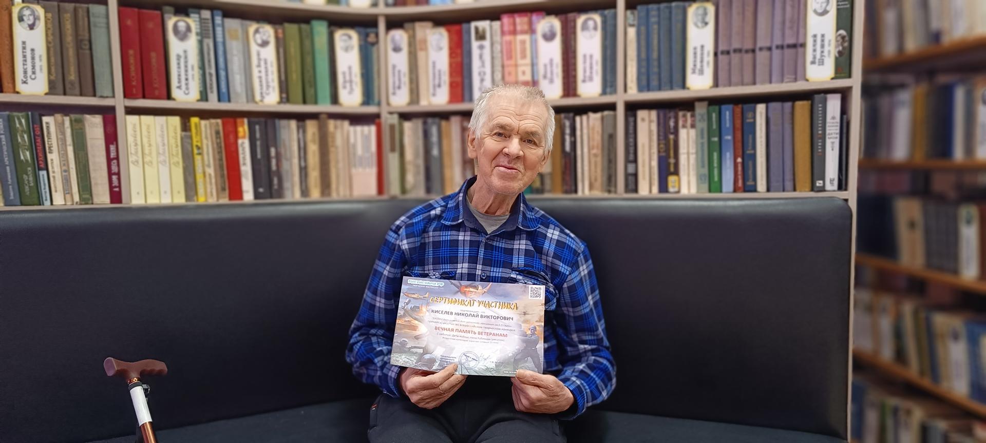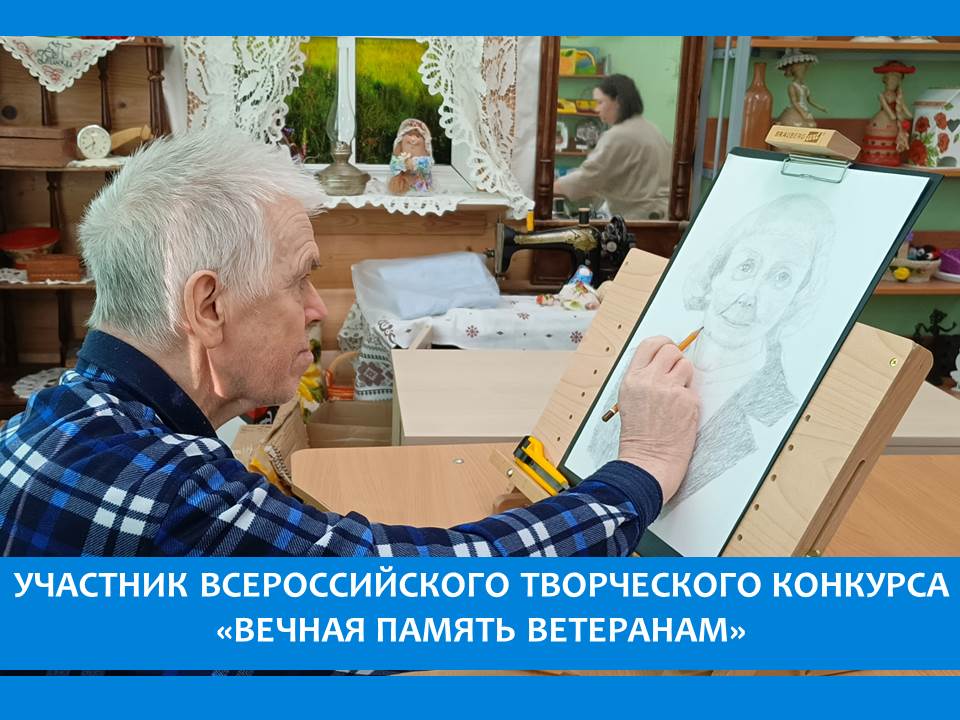 В рамках Областного благотворительного марафона "Живи ярко – делай добро» житель пансионата Киселев Николай Викторович принимает участие в конкурсе «Вечная память ветеранам». В номинации рисунок он готовит для выставки  к 80-летию Победы серию портретов детей  войны, которые проживают в  Вязниковском доме-интернате.