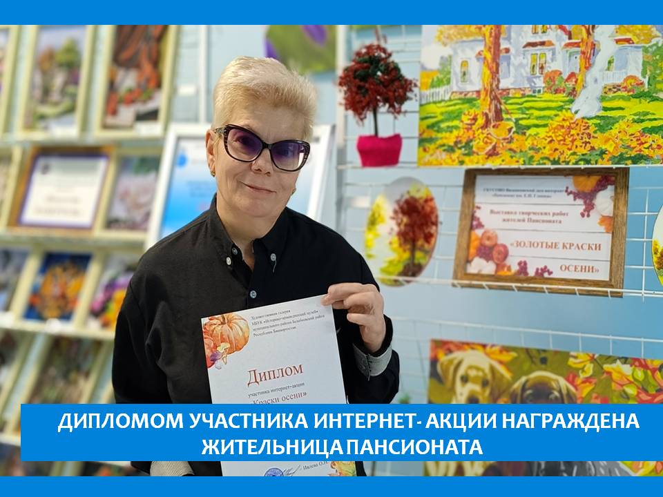 Дипломом за участие в интернет-акции «Краски осени» награждена Наталья Идрисова. «Получение диплома это признание заслуг, повышает работоспособность и желание выкладываться на 100%», - говорит жительница пансионата. Наталья постоянный участник различных акций и конкурсов. Каких только достижений у нее нет, но она не останавливается на достигнутом, а наградная продукция позволяет надолго сохранить в памяти торжественное событие или мероприятие.