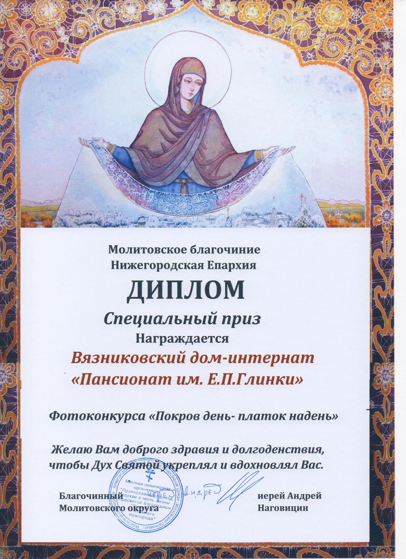 Нижегородская Епархия, Молитовское отделение наградила Дипломом «Пансионат им.Е.П.Глинки» за фотоконкурс «Покров день-платок надень» и пожелала пансионату доброго здравия и долгоденствия. Спасибо за добрые слова!