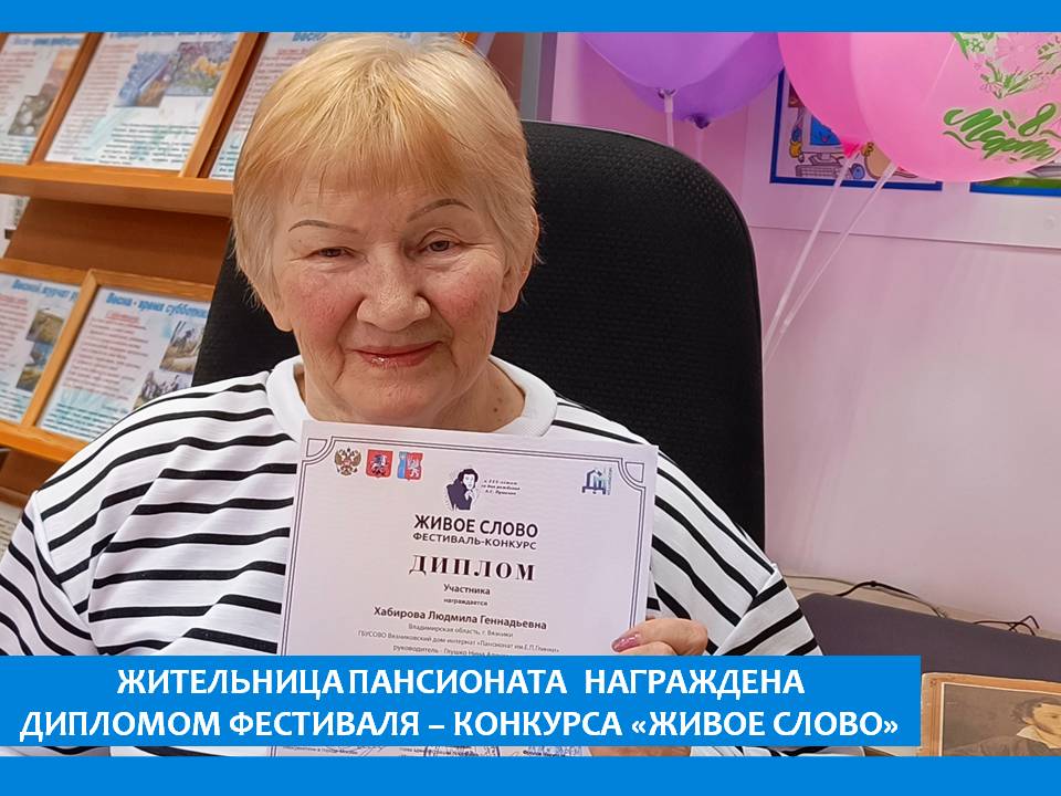 Диплом участника фестиваля – конкурса «Живое слово» приуроченного к 225-летию со дня рождения А.С. Пушкина награждена  жительница пансионата Людмила Хабирова в номинации «Поэзия Пушкина». В ее исполнении прозвучало стихотворение  «Бесы».