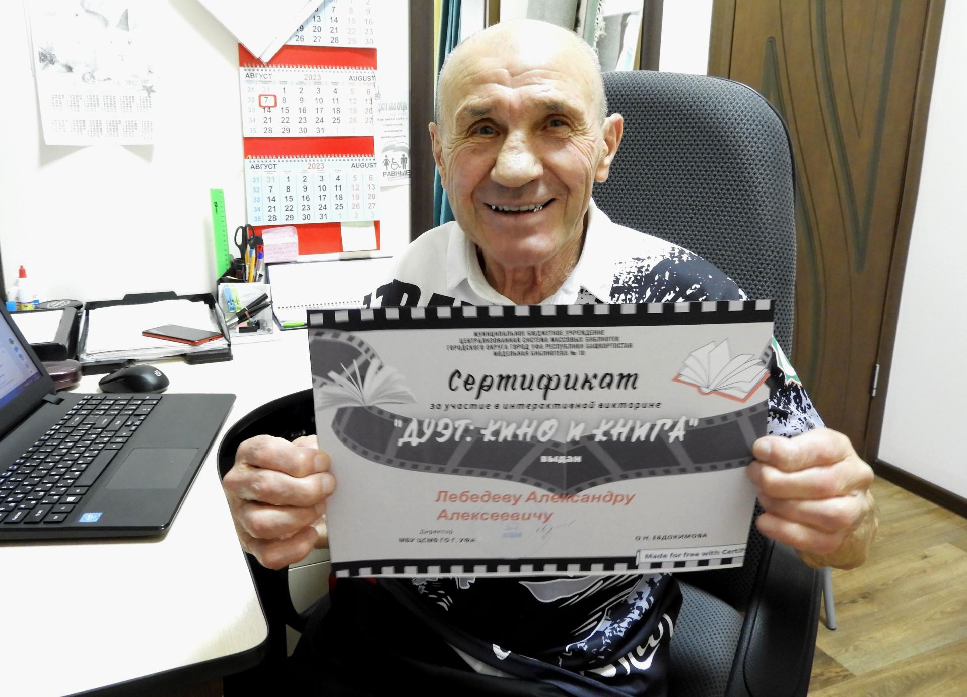 Житель Вязниковского Пансионата Лебедев Александр Алексеевич принял участие в сетевой интерактивной викторине «Дуэт: кино и книга», организованной Централизованной системой массовых библиотек городского округа г.Уфа (Республики Башкортостан). Ответив на вопросы, участник получил именной сертификат. Молодец!
