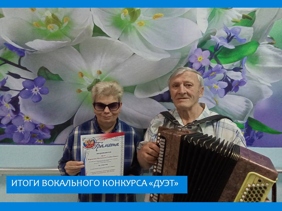 Грамотой по итогам дистанционного вокального конкурса «Дуэт», посвященного Дню России отмечены жители Вязниковского дома - интерната «Пансионат им.Е.П.Глинки» Павел Глебов и Наталья Идрисова. На конкурс участники предоставили видеоролик с исполнением песни посвященной России. Всего на конкурс была подана 51 заявка из разных регионов страны. Общее количество участников - 154 человека. Организатор конкурса МБУ Муниципальное бюджетное учреждение «Центр культуры и досуга» города Армянска Республики Крым.