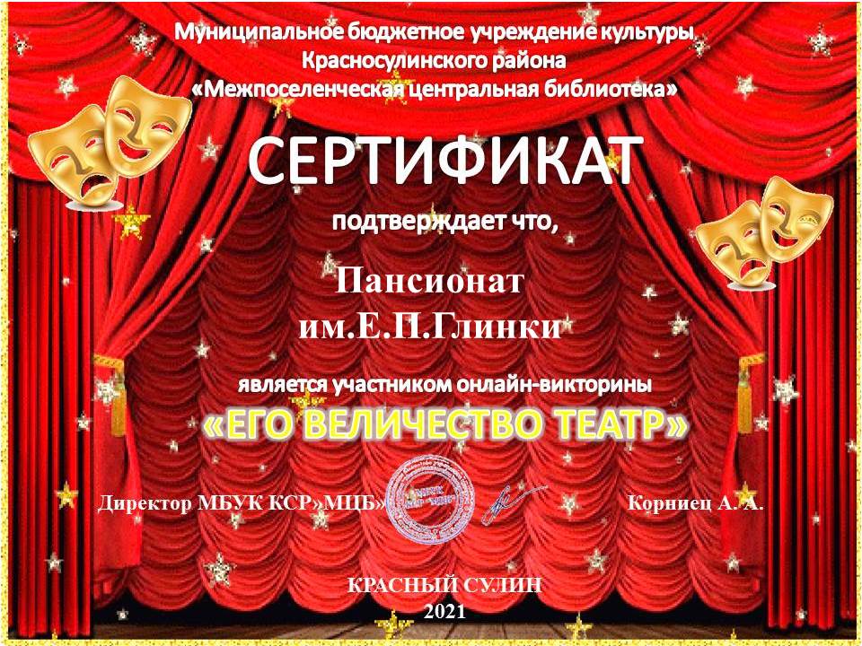 На вопросы   онлайн-викторины «Его величество театр» отвечали Наталья Идрисова и Владимир Калашников, они были отмечены сертификатом. Организатор викторины  #Межпоселенческая центральная библиотека Красносулинского района