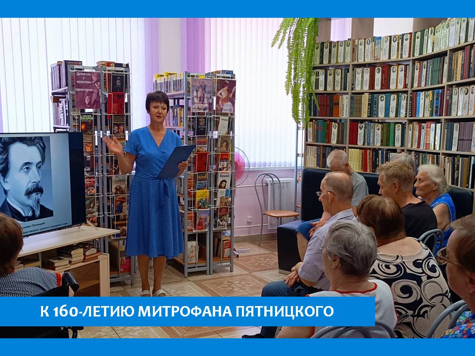 3 июля, исполнилось 160 лет со дня рождения Митрофана Ефимовича Пятницкого (1864–1927), собирателя и исполнителя русских народных песен, посвятившего всю свою жизнь народной музыке, основателя и руководителя знаменитого русского народного хора, который впоследствии был назван его именем. Сегодня,  в рамках клуба «Документальная среда» в библиотеке прошел исторический час о жизни и творчестве   М.Е.Пятницкого. Участники мероприятия   познакомились с истоками   русской песни,  и  с тем, какое место она занимала  в жизни Митрофана Пятницкого. В заключении  посмотрели документальный фильм о музыканте и с удовольствие послушали песни в исполнении хора им.М.Е.Пятницкого.