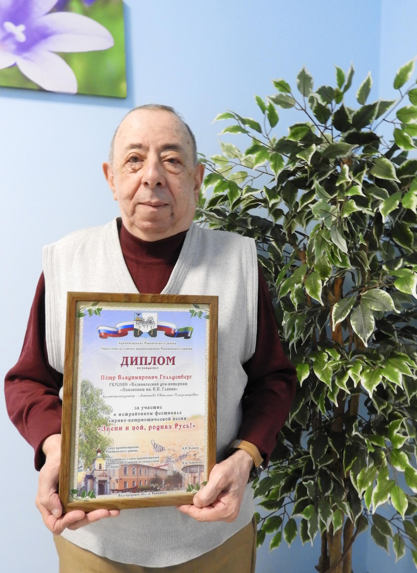 Жители Вязниковского Пансионата не упускают возможность принимать участие в сетевых фестивалях и конкурсах. Своё вокальное мастерство продемонстрировал Пётр Гольденберг, приняв участие в фестивале лирико-патриотической песни «Звени и пой, родная Русь», организованный МУК «Районный организационно-методический центр» Ракитянского района Белгородской области. Пётр Владимирович, как и все участники фестиваля, награждён дипломом. Поздравляем и желаем дальнейших творческих успехов! А организаторам – огромное спасибо за проведение фестиваля и возможность принимать участие людям разных возрастных категорий.
