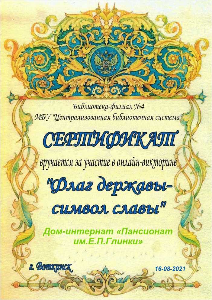 Мероприятие началось с рассказа об  истории создания российского флага. Участники мероприятия с удовольствием участвовали в  викторине «Флаг державы символ славы»,  вопросы которой связаны с государственными символами России,  так же разгадывали кроссворд «Флаг России» и были отмечены сертификатом за участие в онлайн-викторине.