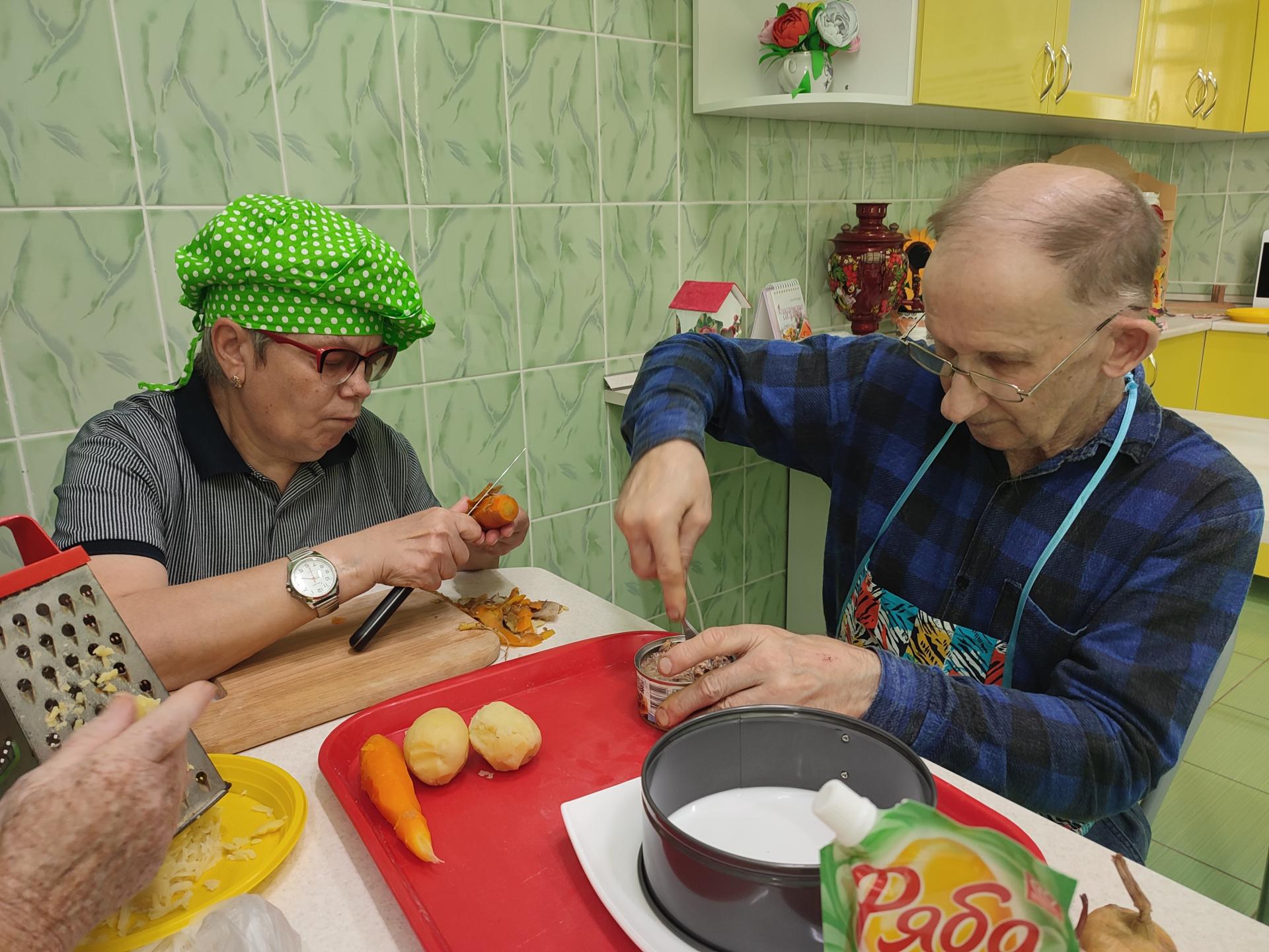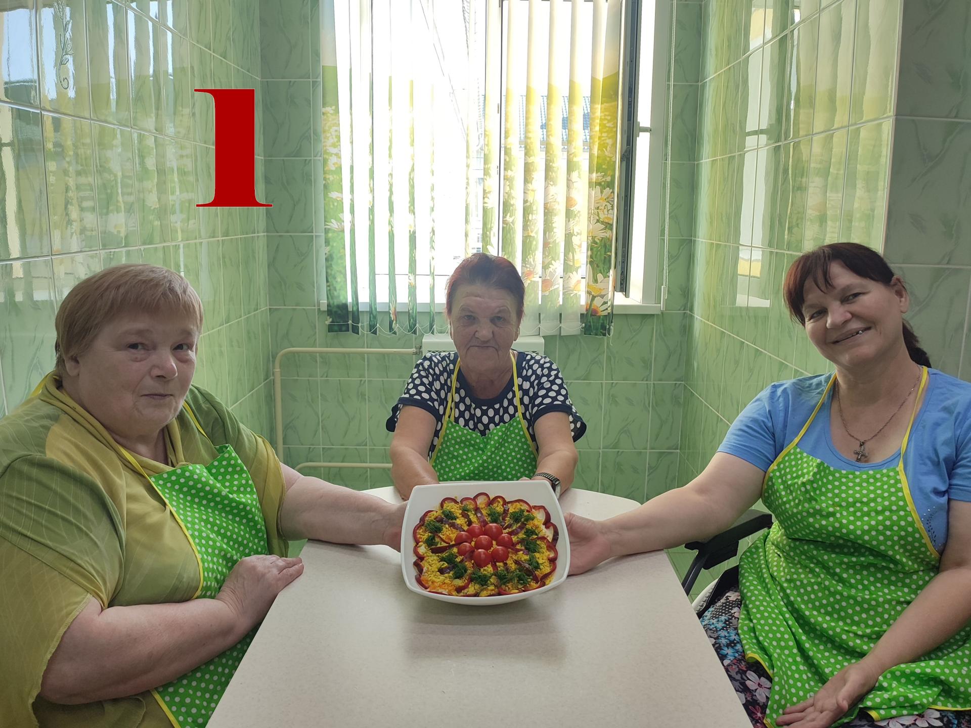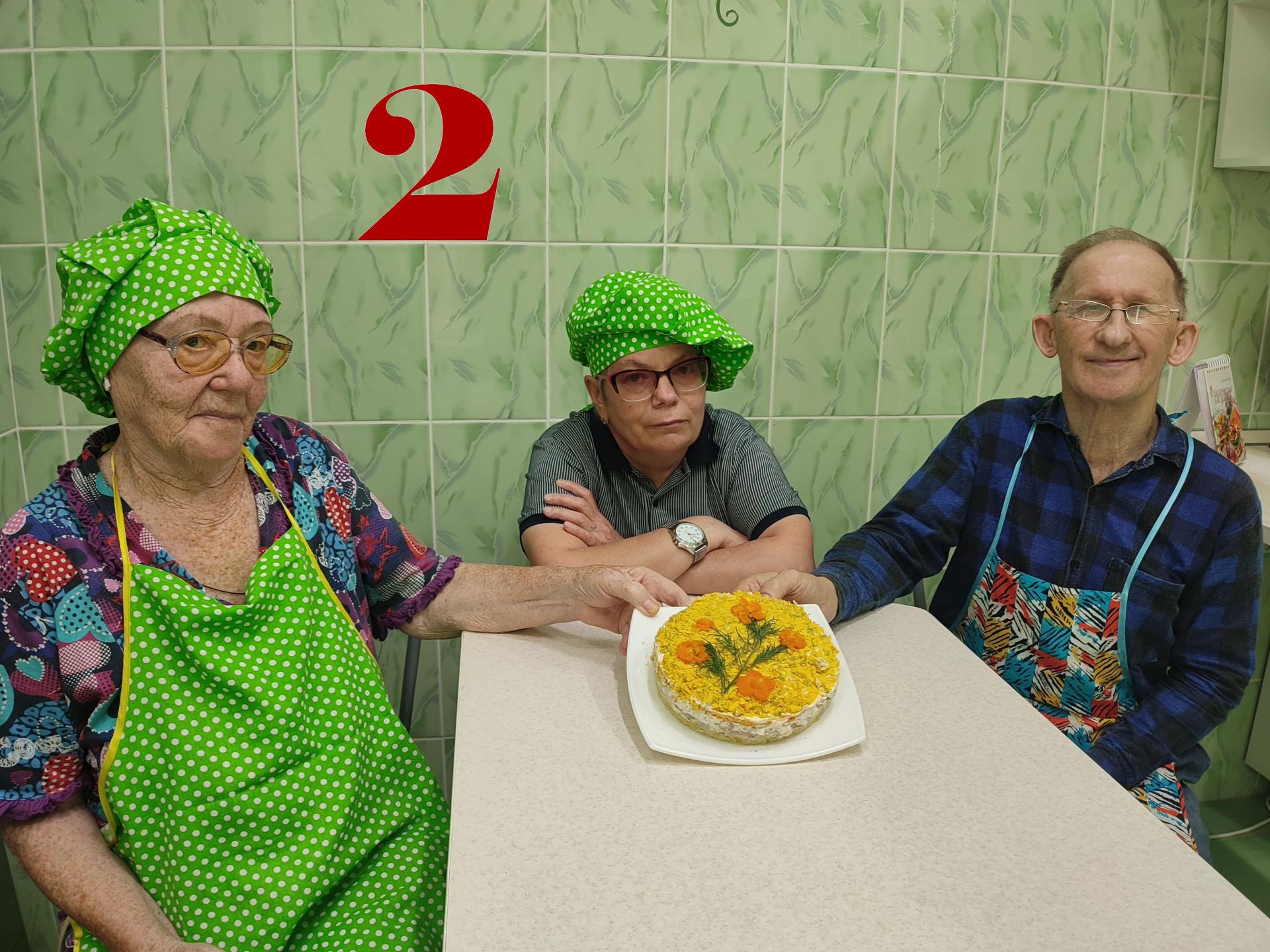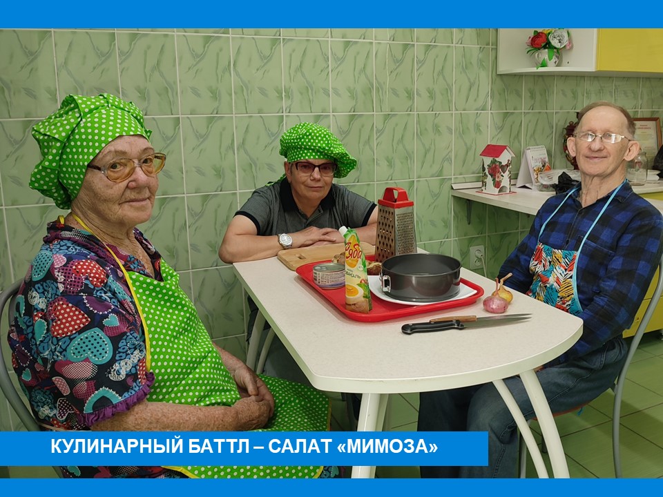 Салат «Мимоза» с консервами – классическое блюдо на праздничный стол и в советский период, и в современное время. Существует множество рецептов данного салата, а также способов его оформления. Вот и жители Пансионата решили провести в «Домашней гостиной» кулинарный баттл по декорированию данного блюда.