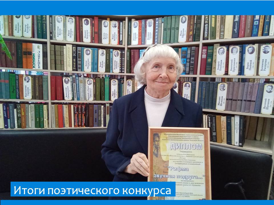 Обладателем Диплома за чтение стихов Пушкина стала жительница пансионата Кубикова Нина Николаевна, за участие в конкурсе «Рифма, звучная подруга…» приуроченному к Дню русского языка и дню рождения великого русского поэта Александра Сергеевича Пушкина. Организатор конкурса Хмельницкий ЦКД Задонского муниципального района Липецкой области.
