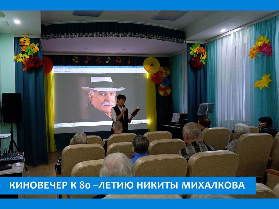 21 октября юбилей отметит кинорежиссер, сценарист, актер и педагог, народный артист РСФСР, Герой Труда РФ, полный кавалер ордена “За заслуги перед Отечеством” Никита Сергеевич Михалков. В пансионате прошел киновечер на котором  рассказывали  о первых шагах юбиляра в кинематографе. С ранних лет для Михалкова было важно прокладывать собственную дорогу — и в жизни, и в профессии. Ему было 18, когда Георгий Данелия предложил сняться в фильме “Я шагаю по Москве”. После выхода картины Михалков проснулся знаменитым...Михалков сейчас  – уже признанный мэтр и тем интереснее возвращаться в прошлое и наблюдать, как развивался талант артиста и режиссера, круг его мыслей. Обо всём этом поговорили на вечере, а  так же посмотрели  художественный фильм «Родня».