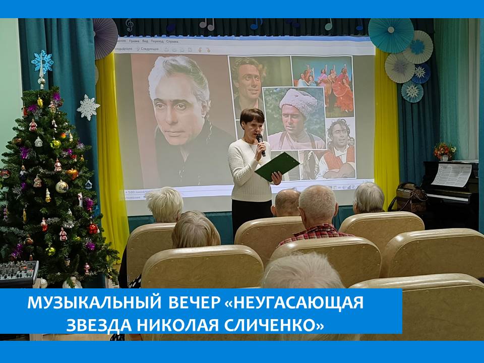 Вечер "Неугасающая звезда» прошел в пансионате и был посвящен актёру, певцу, режиссёру, художественному руководителю единственного в мире цыганского театра, народному артисту СССР Николаю Сличенко. Программа вечера – это дань памяти великому артисту, любовь и признательность. На вечере памяти Николая Алексеевича зрители погрузились в удивительный мир его творчества, наполненный искренностью и глубоким уважением к ромской и русской культуре. Поклонники его творчества с удовольствием посмотрели и послушали песни и романсы в его исполнении.