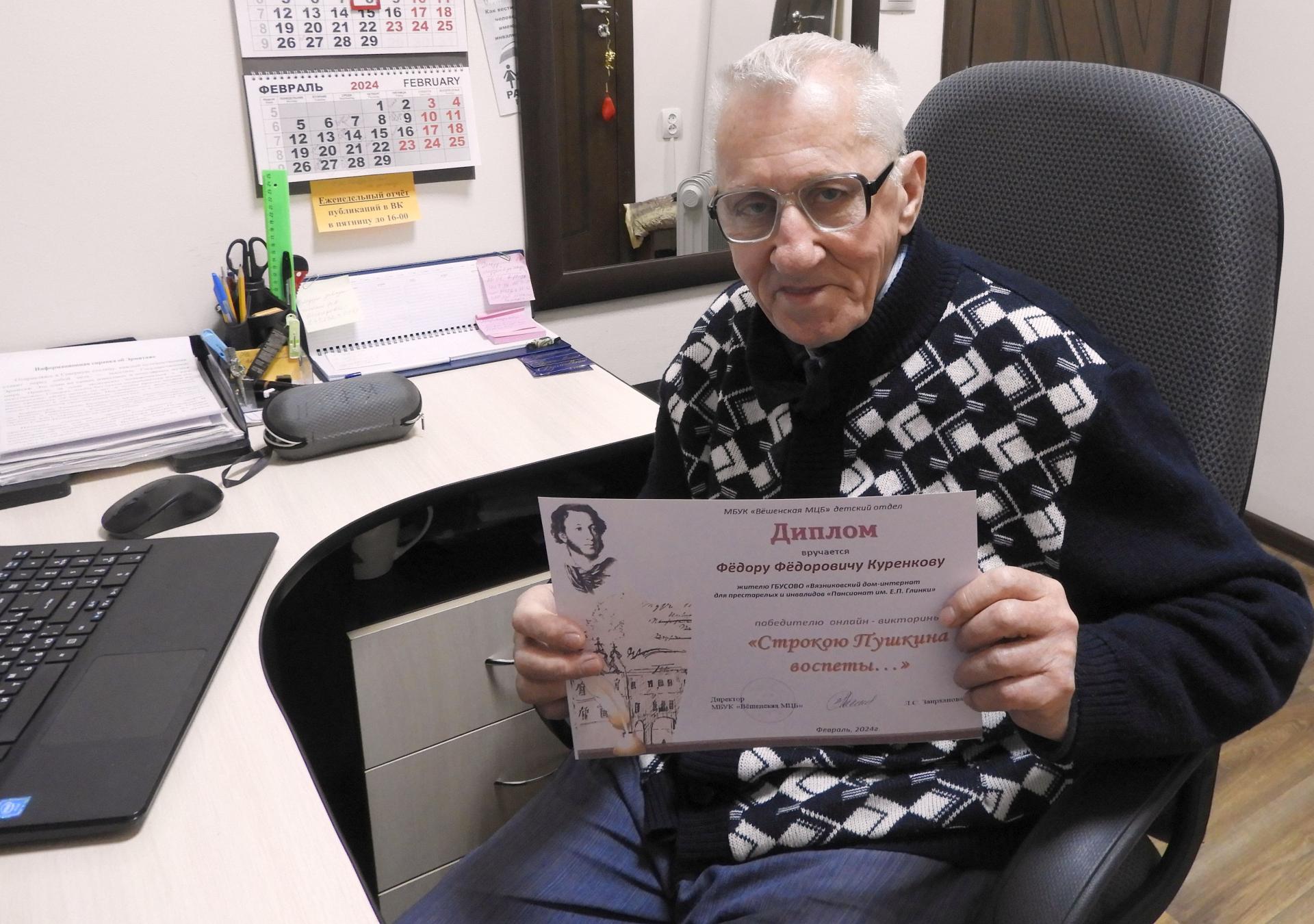 Жители Вязниковского Пансионата чтят память великого поэта, принимая участие в различных мероприятиях. Фёдор Фёдорович Куренков с удовольствием поучаствовал в сетевой викторине «Строкою Пушкина воспеты…», организованной Вёшенской межпоселенческой центральной библиотекой (Ростовская область). Вопросы касались как биографии поэта, так и его творчества. Выполнив все задания, Фёдор Фёдорович был вознаграждён дипломом!