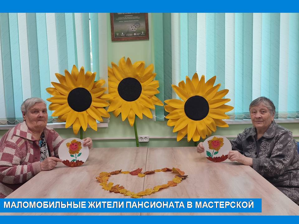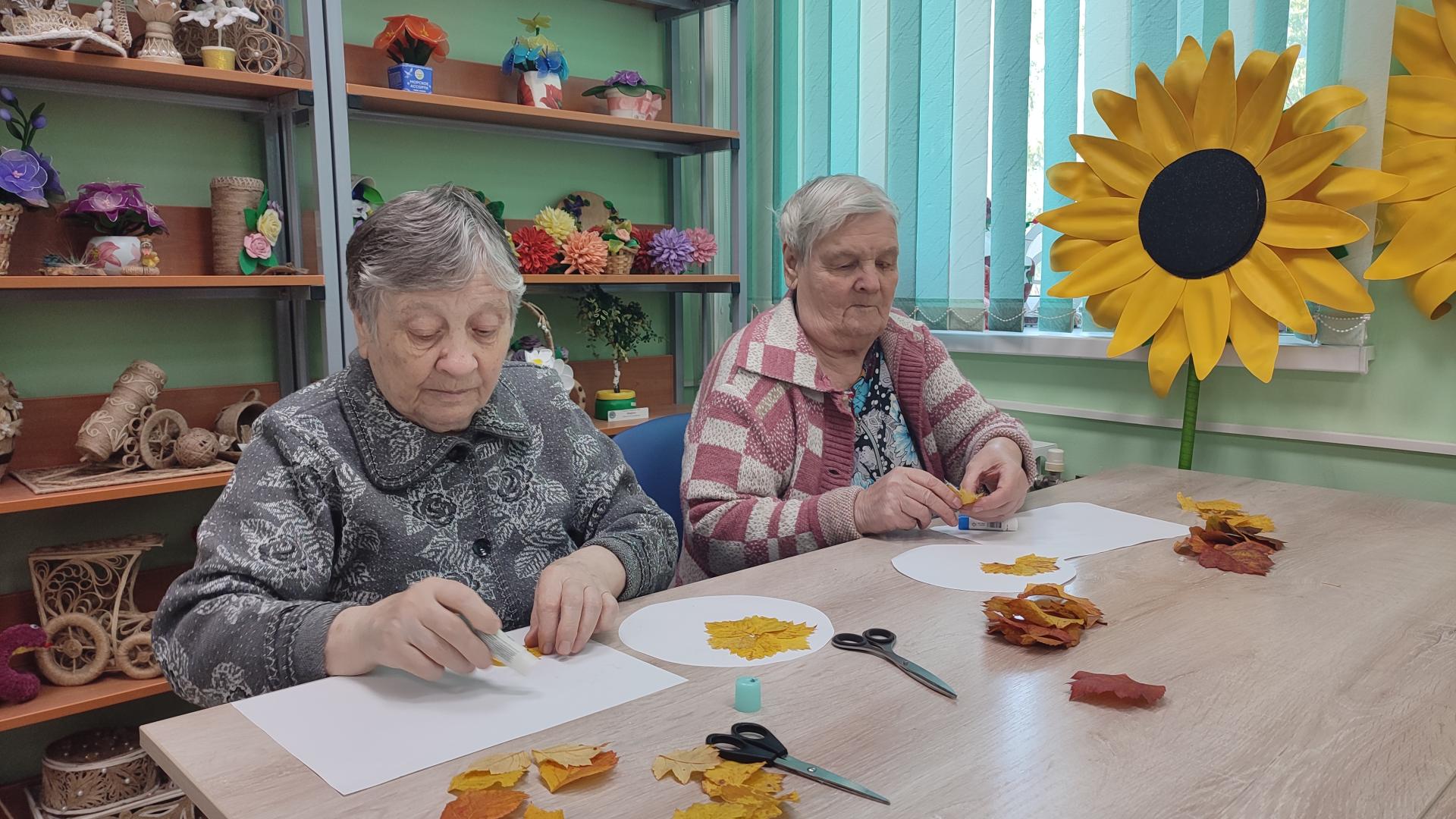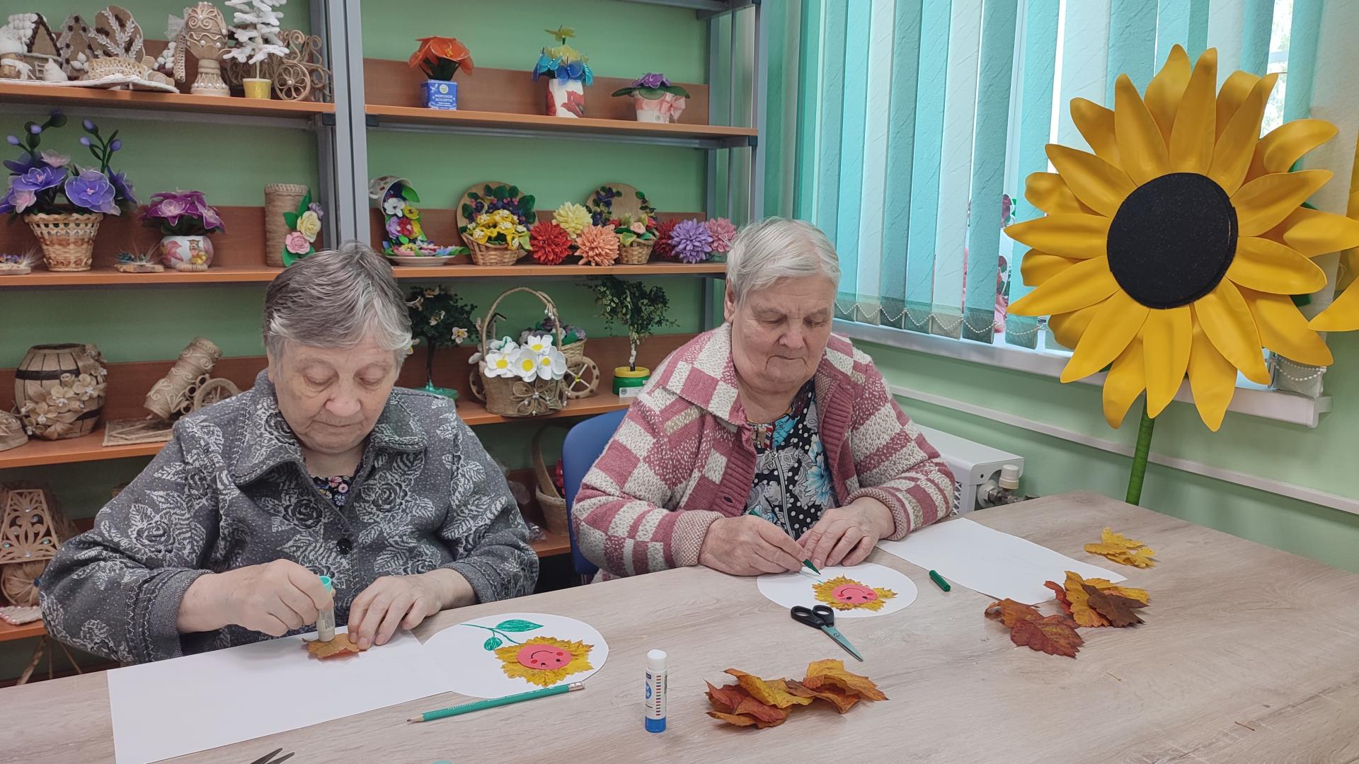 Во время прогулки маломобильные жители Пансионата, любуясь осенними красками, собрали яркие листья, чтобы изготовить аппликации. В творческой мастерской, вооружившись клеем, приступили к работе. А яркие подсолнухи, находившиеся рядом, задали сюжет. Вот такие получились работы у наших жительниц.