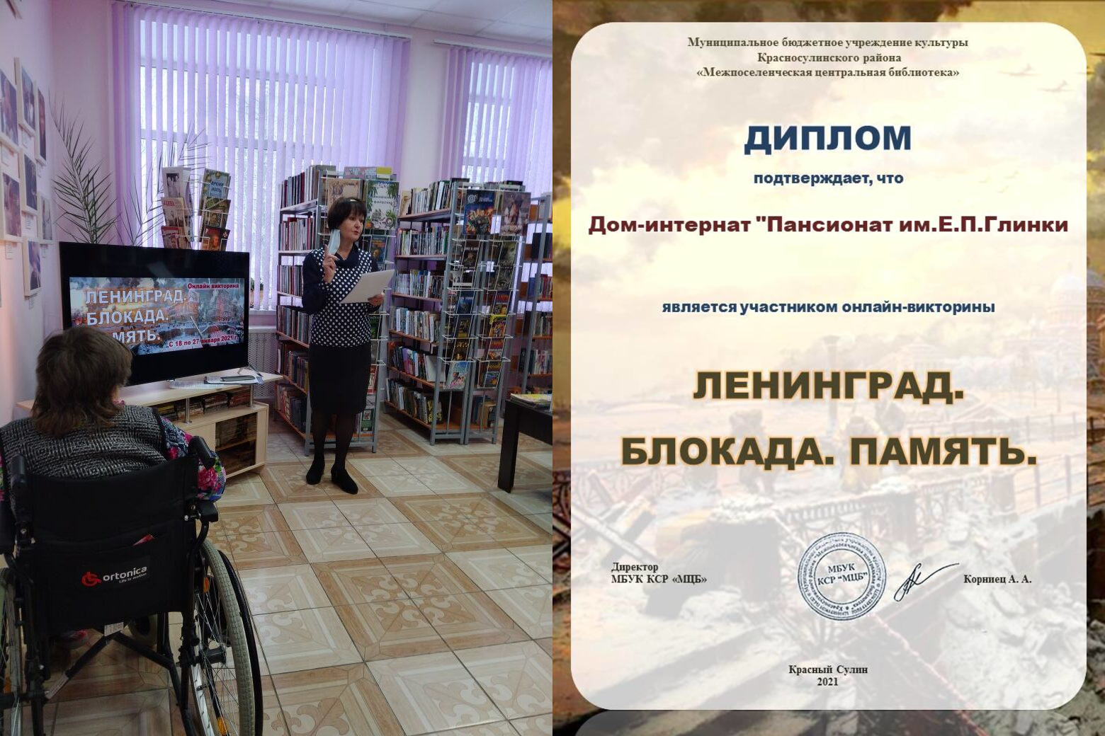 Блокада Ленинграда – одна из самых трагических и печальных страниц в истории нашей страны. Подвиг, который не меркнет в памяти поколений. В память о мужестве и самоотверженности защитников города Ленинграда был учрежден День воинской славы России — День снятия блокады города Ленинграда. 27 января 1944 года была прорвана блокада Ленинграда, которая продолжалась почти 900 долгих дней и ночей. Жители пансионата им.Е.П.Глинки приняли участие в онлайн-викторине «Ленинград. Блокада. Память» и были отмечены дипломом за участие. #Помним_Чтим_Гордимся_Благодарим#Красносулинская_библиотека2021