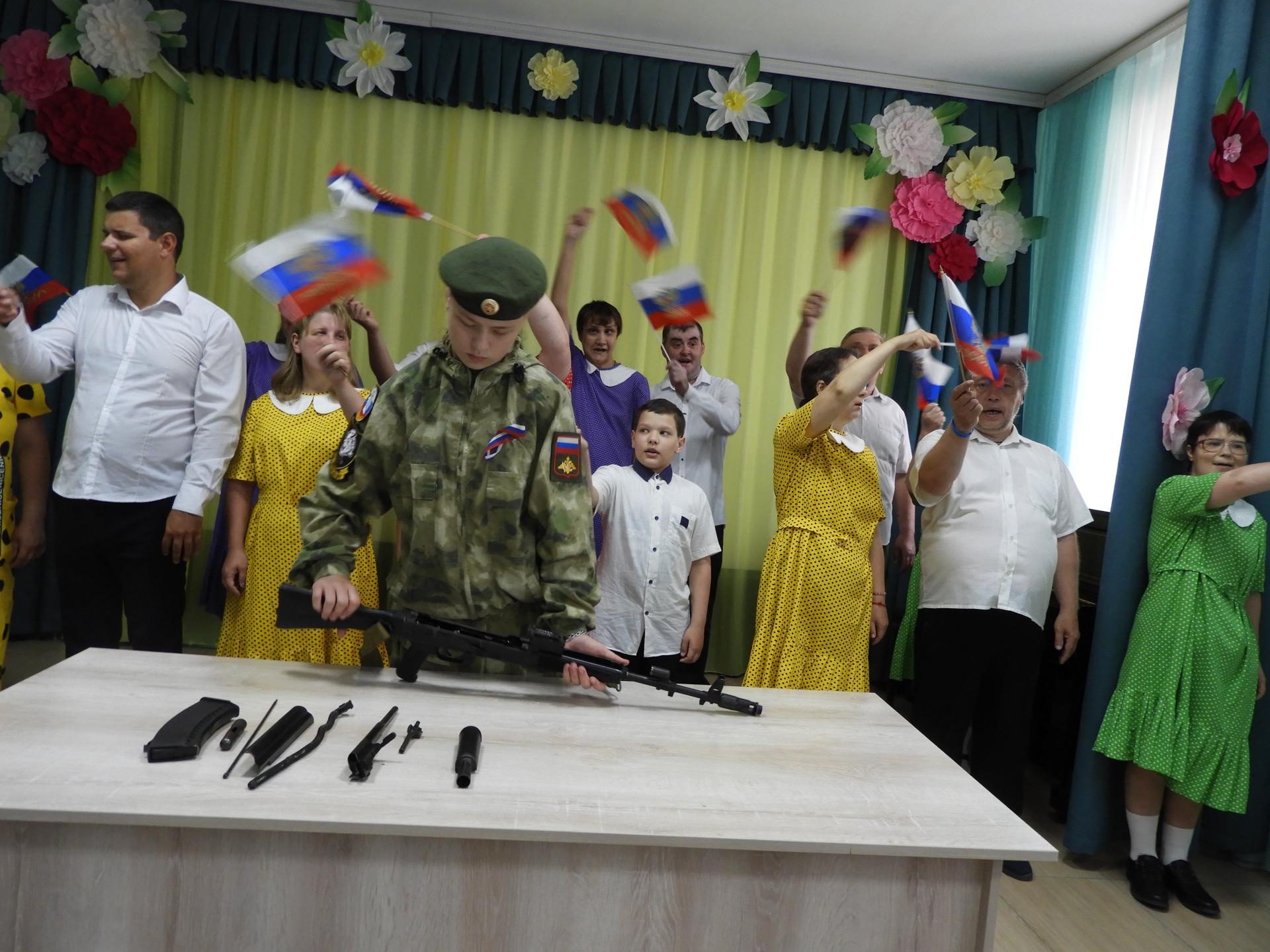 В программе акции звучали песни и стихи о Родине, о любви, о вере, о жизни на прекрасной русской земле. Выступление артистов настолько было патриотичным, что их энергетика передалась в сердца зрителей. А ещё, совместное исполнение нашей «Катюши», как-бы объединило и сплотило всех присутствующих. По-настоящему кульминационным и захватывающим стал завершающий аккорд акции – это демонстрация разборки и сборки автомата на фоне множества российских флажков под песню Олега Газманова «Россия, вперёд!»