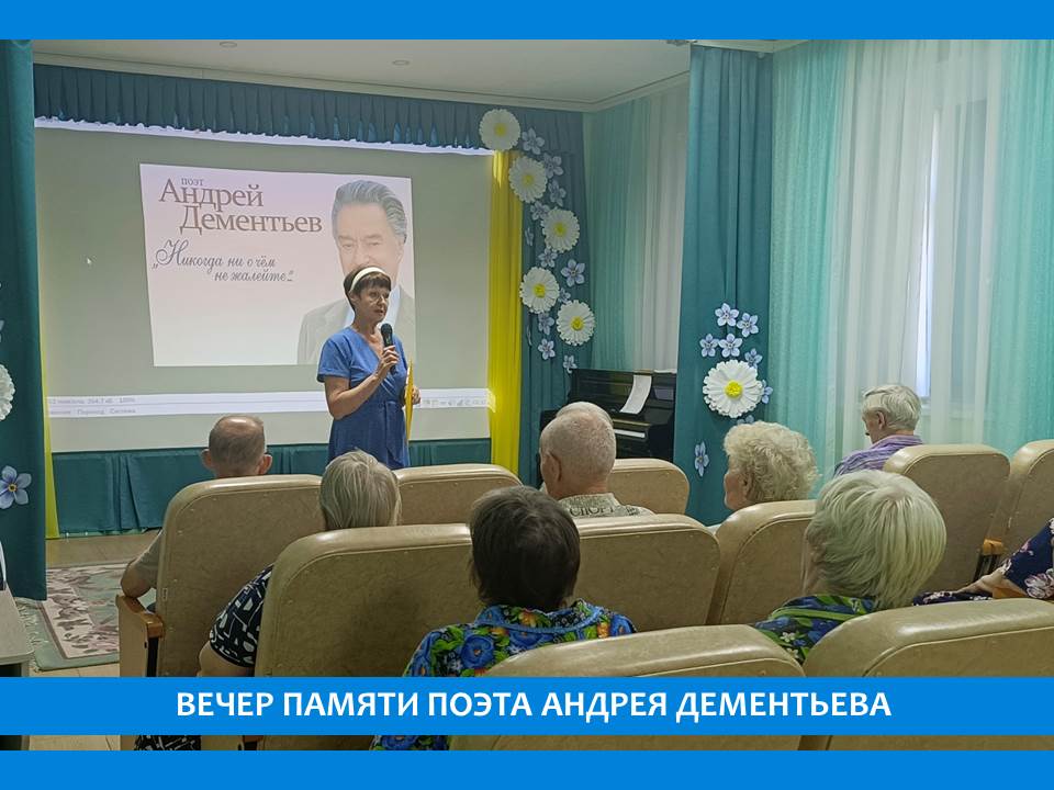 В пансионате прошел литературно-музыкальный вечер, посвященный творчеству Андрея Дементьева. Поэзия А. Дементьева глубоко лирична, гражданственна, отличается яркими красками и доверительной простотой слова. Читая стихи А. Дементьева, словно припадаешь к прозрачному источнику, который даёт силы жить, творить добро, оставаться людьми в любой ситуации. Начался вечер с документального фильма «Гордость земли Тверской», а затем участники встречи выразительно, с душой читали произведения знаменитого поэта. Изюминкой вечера стали песни на стихи поэта. С большим удовольствием и радостью слушали мелодичные популярные песни «Лебединая верность», «Аленушка», «А мне не надо от тебя», «Отчий дом», «Баллада о матери», «Я жду весну» и другие замечательные произведения.