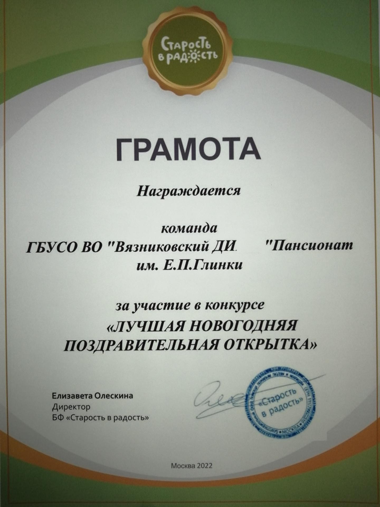 В рамках совместной работы с Благотворительным  Фондом «Старость в радость» серебряные волонтеры «Вязниковского Пансионата им.Е.П.Глинки» - члены клуба «ДоброStar» приняли участие в конкурсе «Лучшая новогодняя поздравительная открытка». Серебряные волонтеры, применив технику «квилинга»,  стали  победителями и  были награждены Грамотой!  От всей души  поздравляем серебряных волонтеров  с заслуженной наградой!