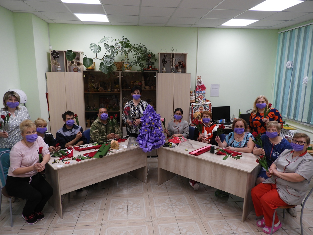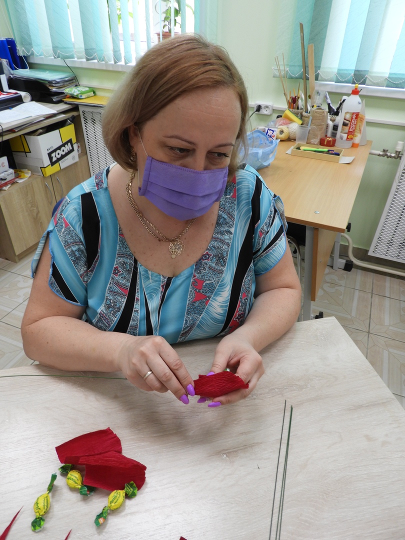 В режиме самоизоляции жить очень непросто, сотрудники нашего Пансионата, стараясь поддержать и обеспечить жителей всем самым необходимым, порой забывают о себе. Чтобы отвлечься от работы, расслабиться и заняться интересным делом, было решено провести мастер-класс по изготовлению подарочного сувенира «конфетный букет». Творчество вдохновляет, когда участники мастер-класса увидели, какую красоту они сотворили – настроение поднялось, а уставшие лица засияли улыбками. Желаем всем нашим коллегам крепкого здоровья, успехов в труде, и пусть творчество и красота дарит вам радость!