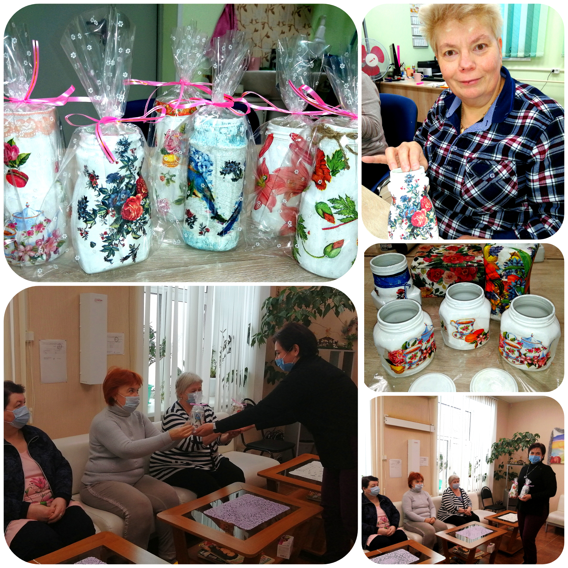 В рамках реализации мероприятий благотворительного марафона «ЖИВИ ЯРКО - ДЕЛАЙ ДОБРО!»  в творческой студии нашего Пансионата прошло занятие  по изготовлению вазочек в технике «Декупаж» . Участники мастер-класса – они же серебряные волонтеры добровольческого клуба «ДоброStar», оказали благотворительную помощь и передали  готовые вазы в подарок  пожилым женщинам и инвалидам отделения  дневного пребывания комплексного центра социального обслуживания населения города Вязники.