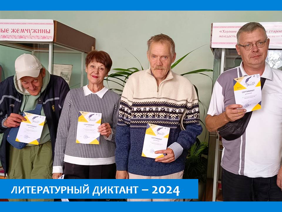 Участники из числа жителей пансионата, ответили на  20 разнообразных вопросов в тестовой форме и были отмечены сертификатами за участие. Акция «Литературный диктант» впервые состоялась в 2021 году по инициативе Мурманской областной научной библиотеки при поддержке Министерства культуры Мурманской области.