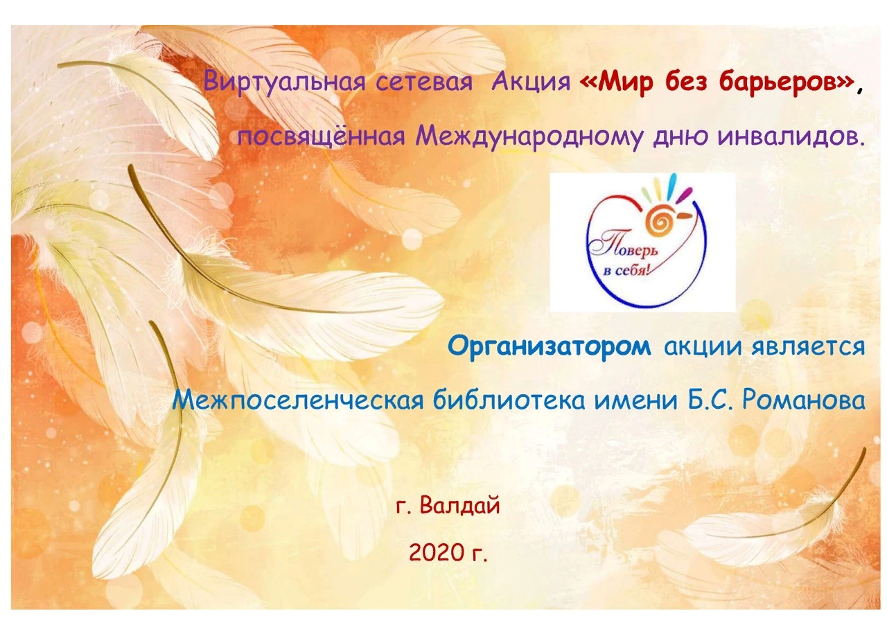 Пансионат им.Е.П.Глинки принимает участие в сетевой акции «Мир без барьеров», посвященной Дню инвалида. Организатор Межпоселенческая библиотека имени Б.С. Романова города Валдая. #Мирбезбарьеров #валдайбиблиотека
