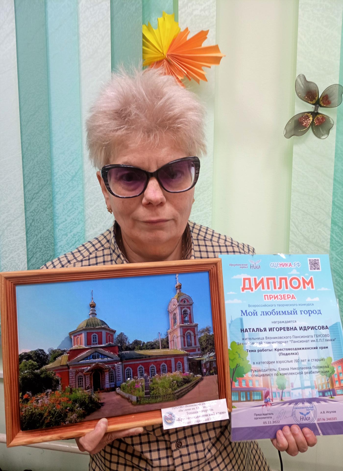 В рамках проекта «Активное долголетие» 1 ноября жительница нашего Пансионата Наталья Игоревна Идрисова приняла участие в творческом  всероссийском конкурсе образовательного портала «Ника» «Мой любимый город». Наталья Игоревна представила работу, выполненную в технике папертоль  «Крестовоздвиженский храм», на которой изображена одна из самых узнаваемых достопримечательностей города Вязники.  Наталья Игоревна мастерица на все руки, а данную технику она освоила в совершенстве, благодаря чему её работа  стала победителем конкурса и была награждена Дипломом Победителя!