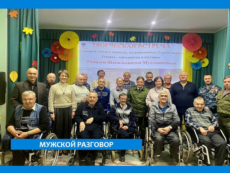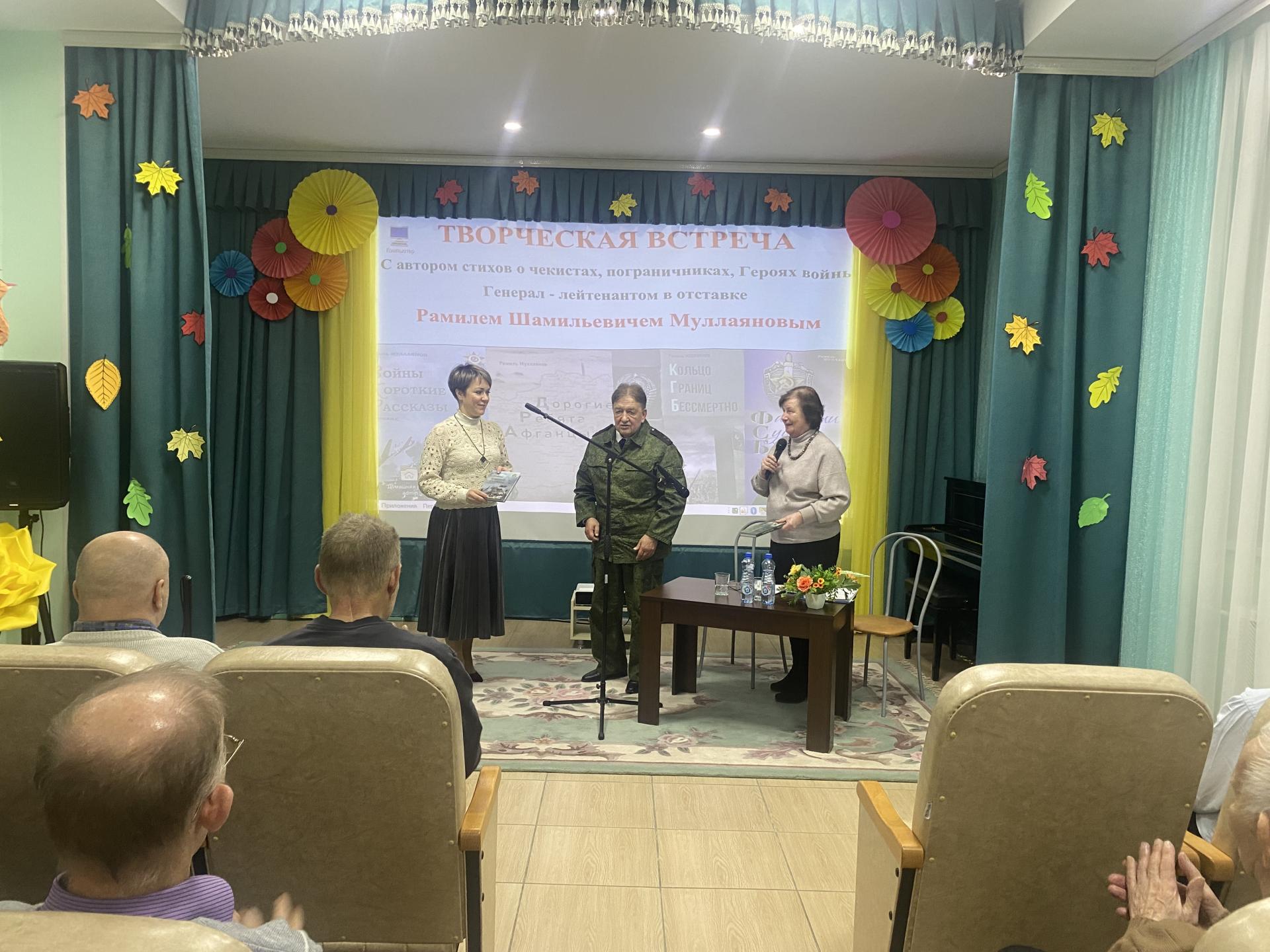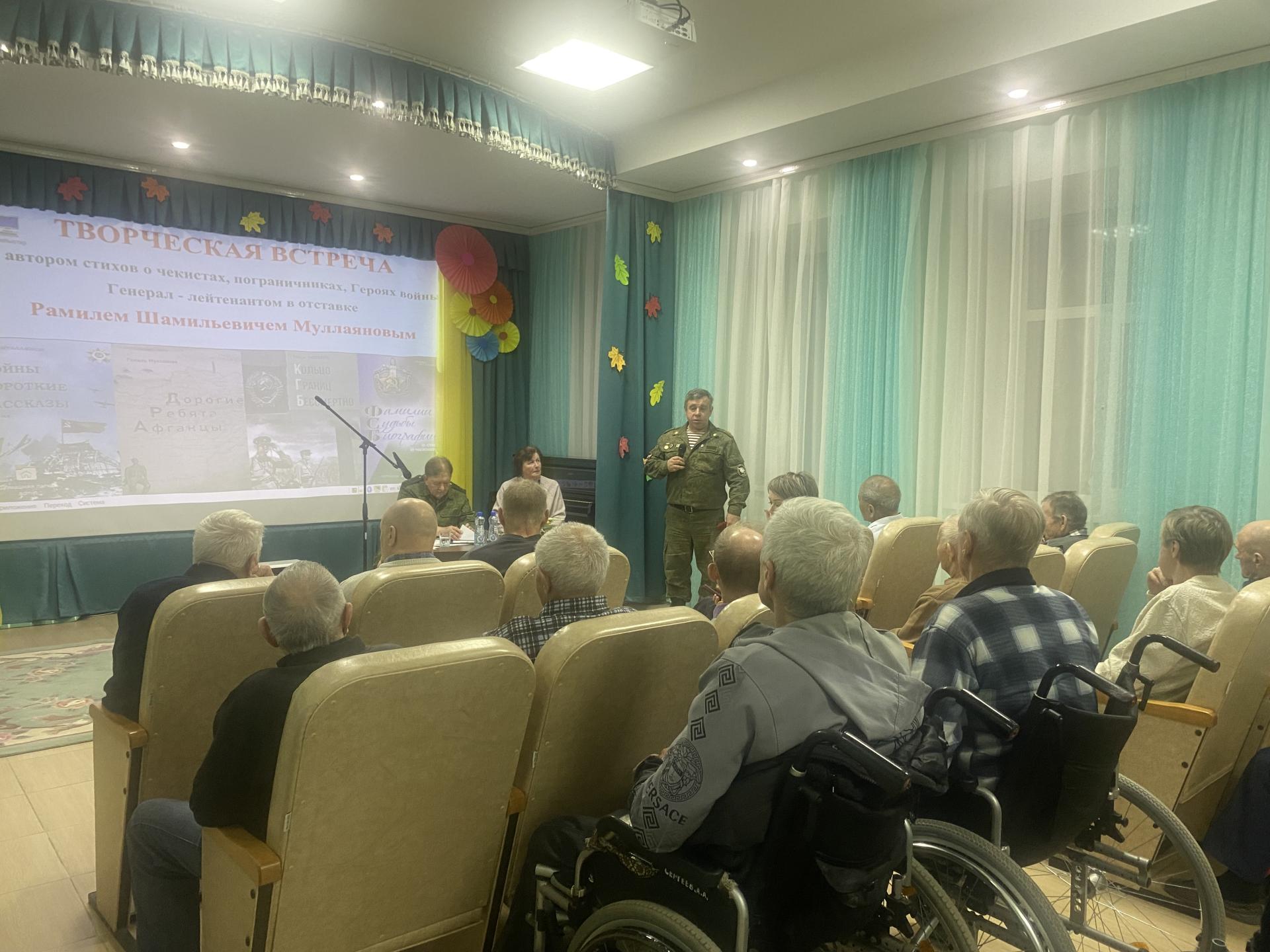 В рамках проекта #ДЕДы-непоседы в пансионате состоялась патриотическая встреча с генералом-лейтенантом запаса пограничных войск, писателем и поэтом, членом Союза писателей России, кандидатом политических наук, Муллаяновым Рамилем Шамилевиче и вязниковским отделением «Боевое братство». На конкретном примере жители пансионата увидели, что настоящие герои живут рядом, что мужество, храбрость, любовь к Родине – это качества настоящего человека. Из уст генерала-лейтенанта звучали стихотворения собственного сочинения.. Встреча вызвала уважение и сопереживание в сердце каждого мужчины.