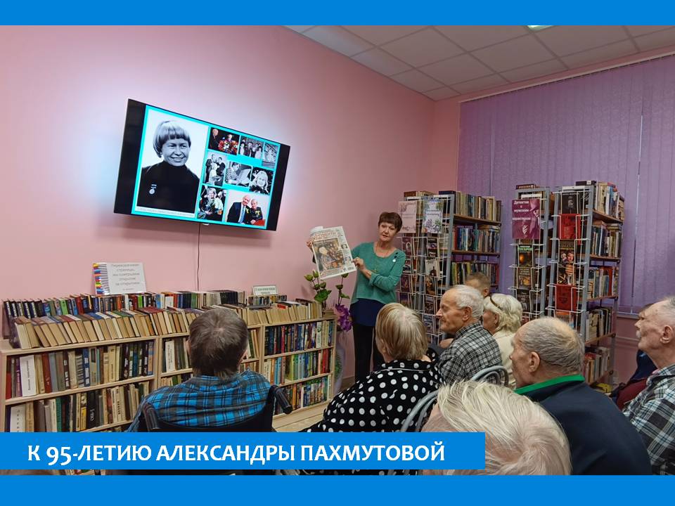 В библиотеке пансионата в рамках клуба «Документальная среда» прошло мероприятие, посвященное творчеству композитора Александры Пахмутовой. По ее песням можно проследить важнейшие даты в истории нашей страны. 9 ноября народной артистке СССР, композитору, пианистке исполняется 95 лет.
