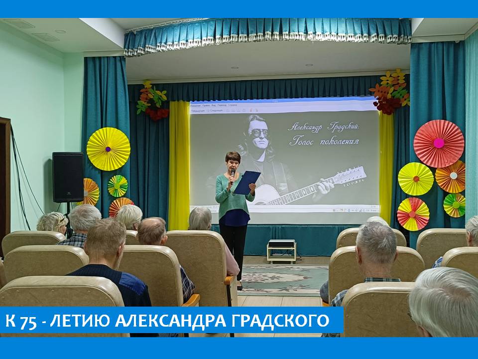 Для жителей пансионата  прошел вечер памяти Александра Градского. Он  по праву считается одним из основоположников русского рока, но его музыкальная карьера вместила работы в самых разных жанрах — дерзких, эстрадных, академических. На вечере  вспоминали  его как  замечательного певца, композитора, народного артиста, автора и исполнителя песен. Участники посмотрели видеоматериалы выступлений и музыкальных произведений Александра Градского.  Он  был творчески разносторонний человек:  играл на гитаре, баяне, саксофоне, скрипке и других инструментах. Все присутствующие ощутили неповторимую атмосферу, созданную музыкой и словами. Мероприятие стало настоящим праздником для всех любителей творчества артиста.