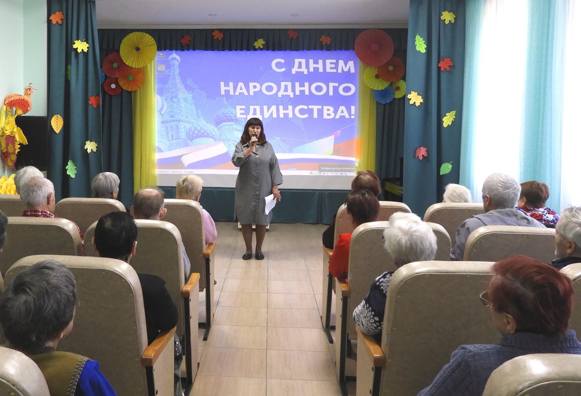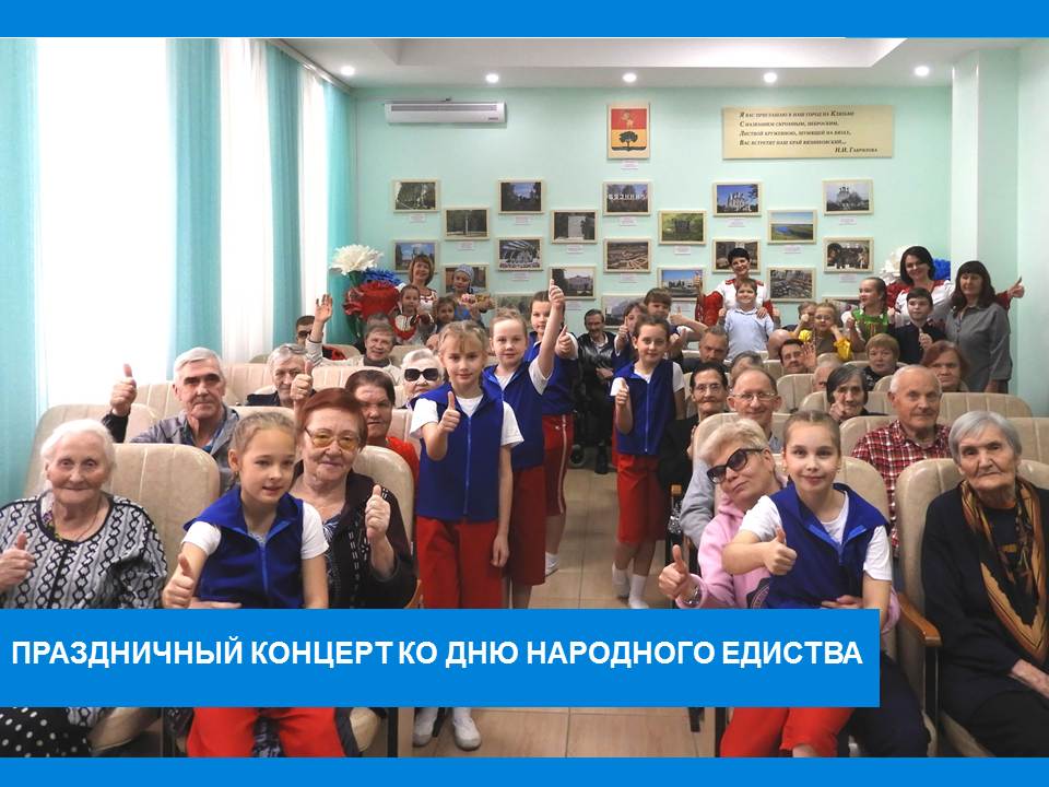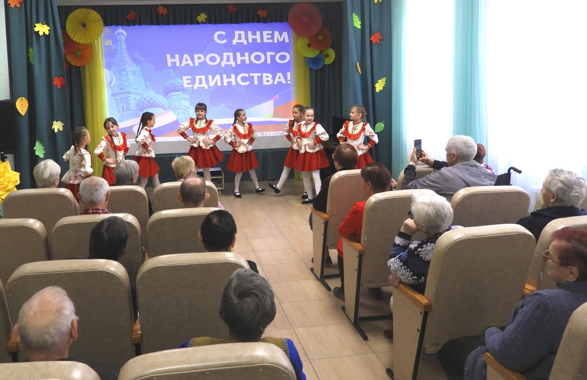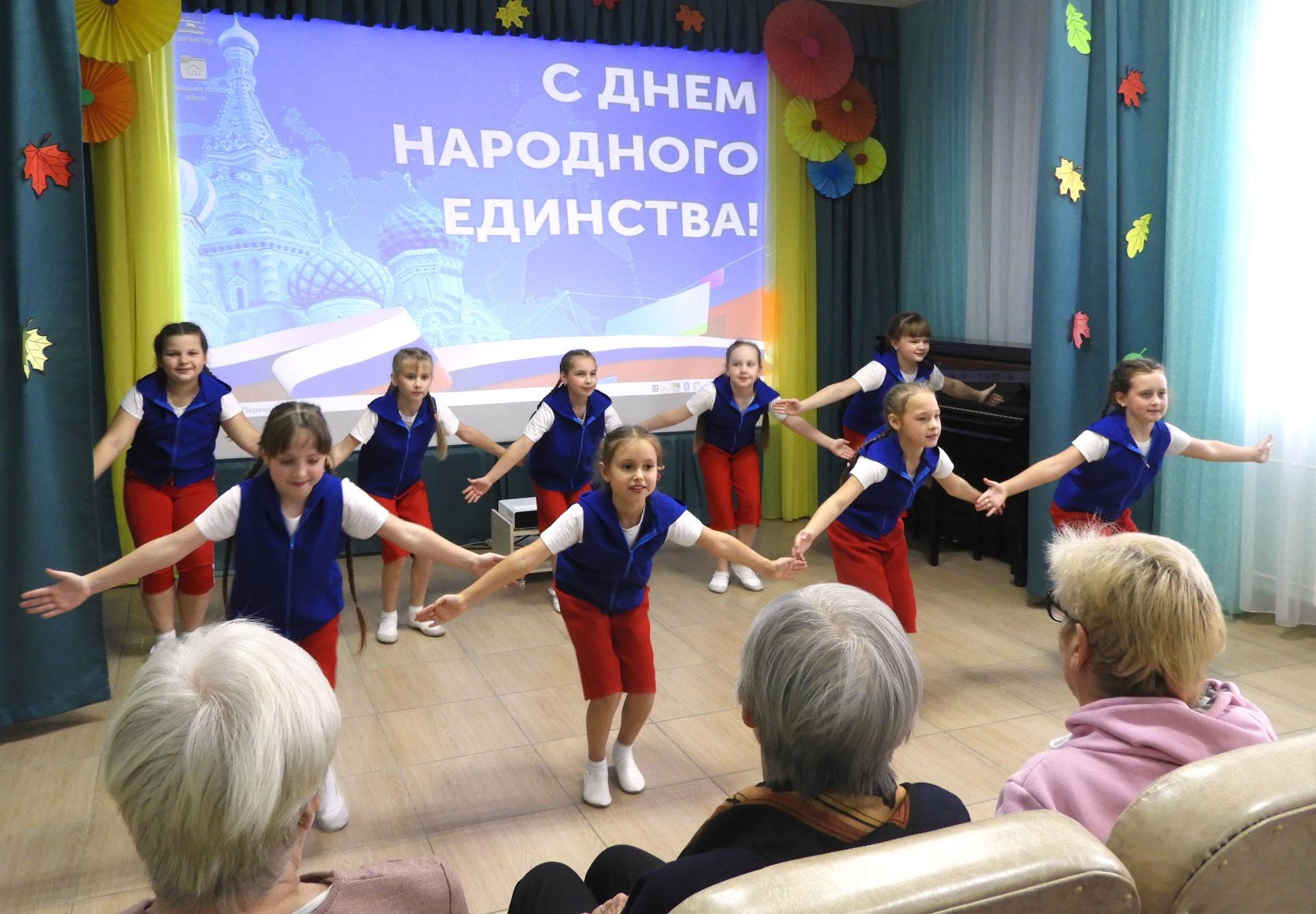 В преддверии этого знаменательного праздника, в Вязниковском Пансионате прошёл концерт «Мы едины!», который дарили педагоги и студийцы Центра дополнительного образования для детей. Яркие костюмы, песни, стихи, танцы – всё это тронуло до глубины души жителей Пансионата. Они аплодировали артистам, а порой, даже, выкрикивали «Браво!» и это было заслуженно. Это была радость, это был праздник! Бабушкам и дедушкам такие эмоции просто необходимы, чтобы чувствовать себя счастливыми.