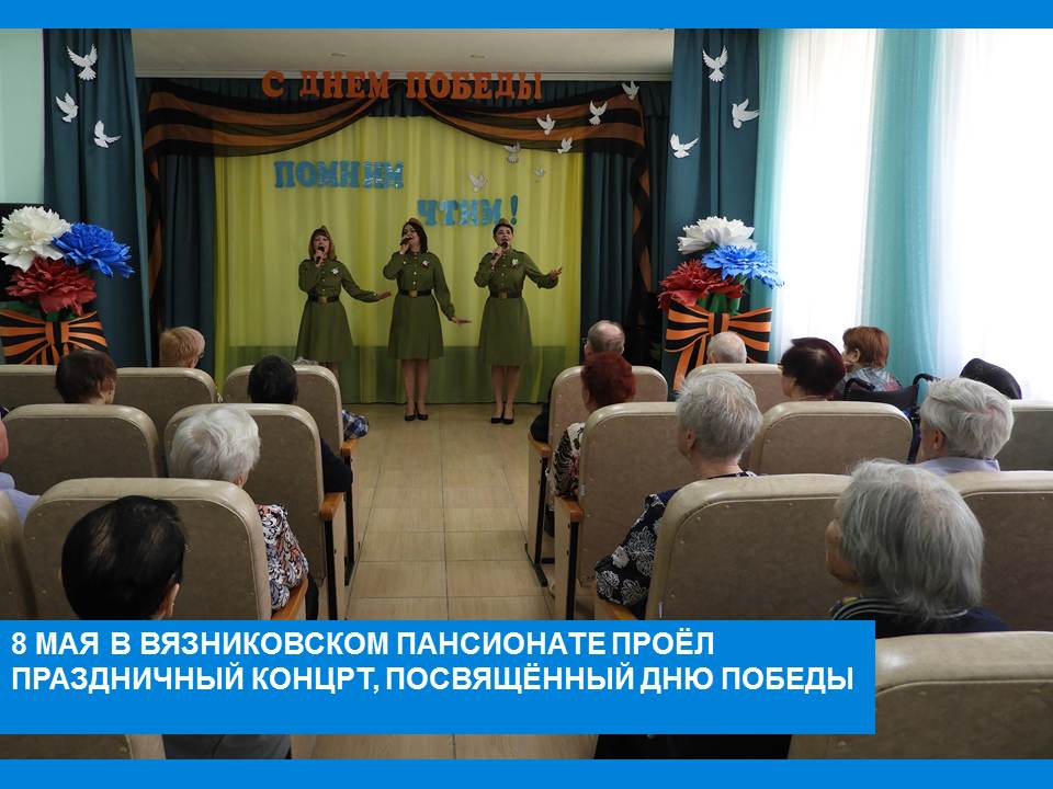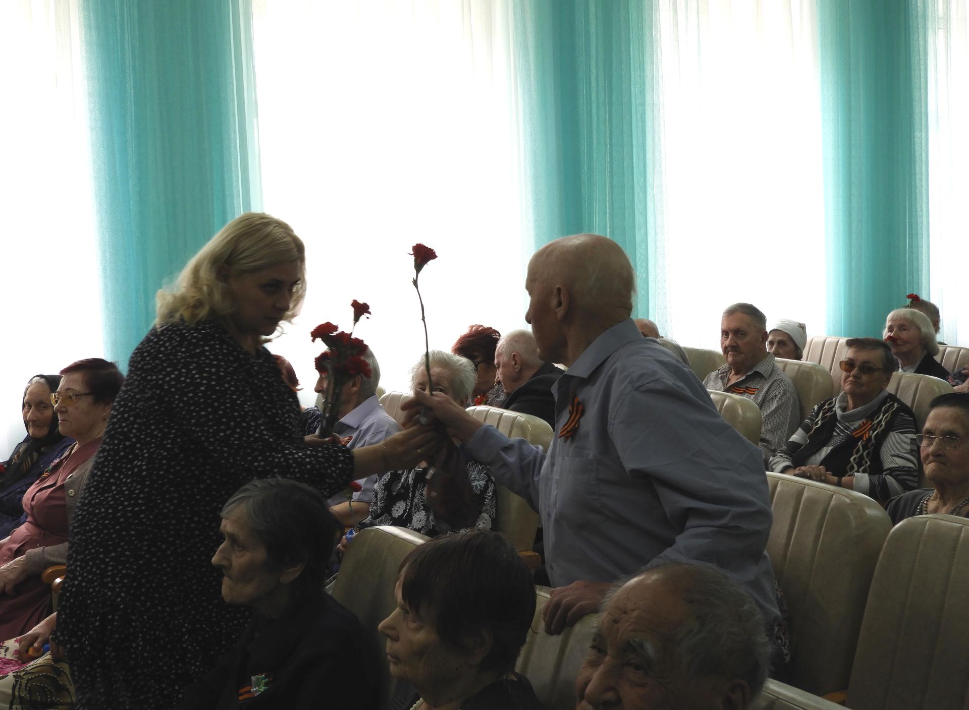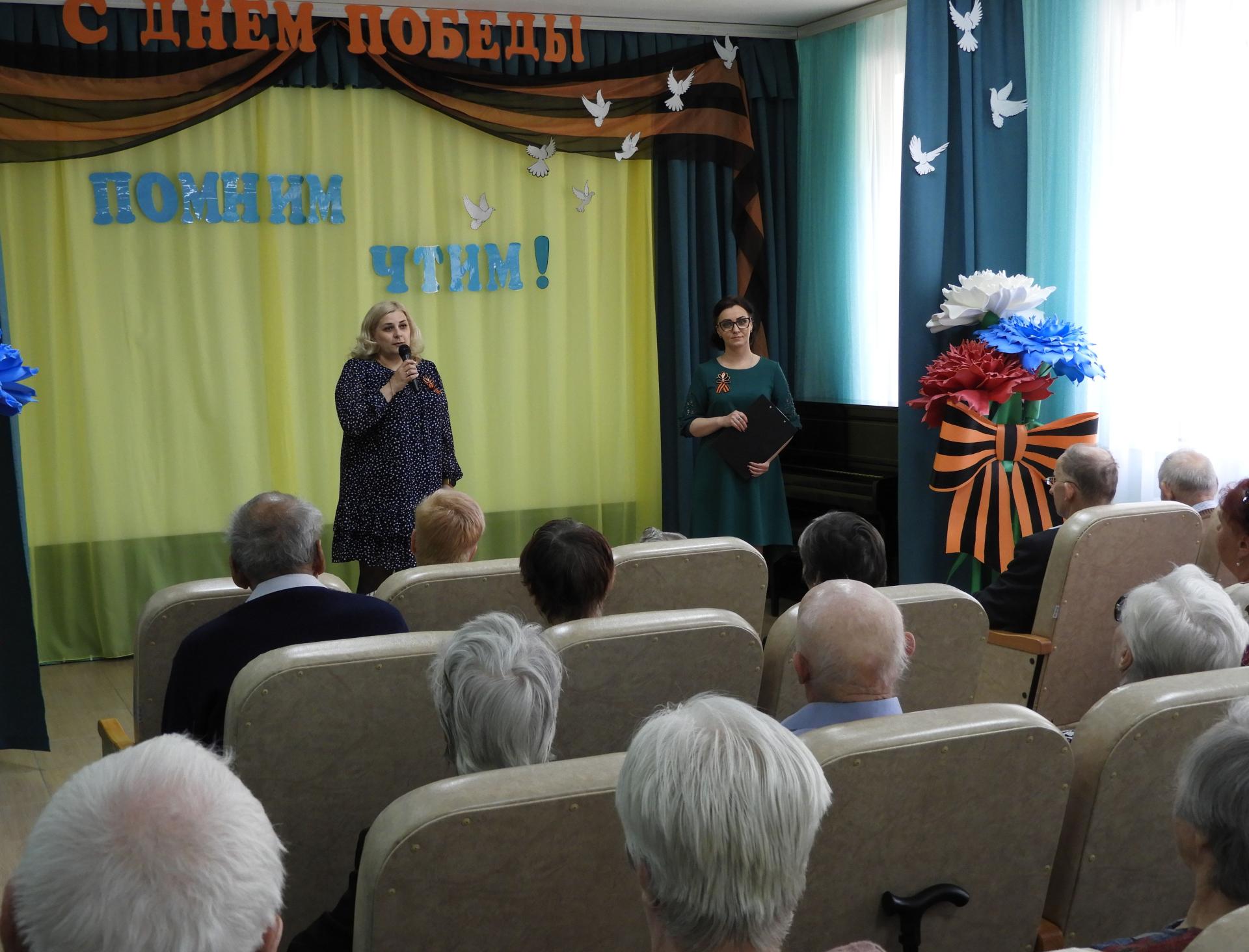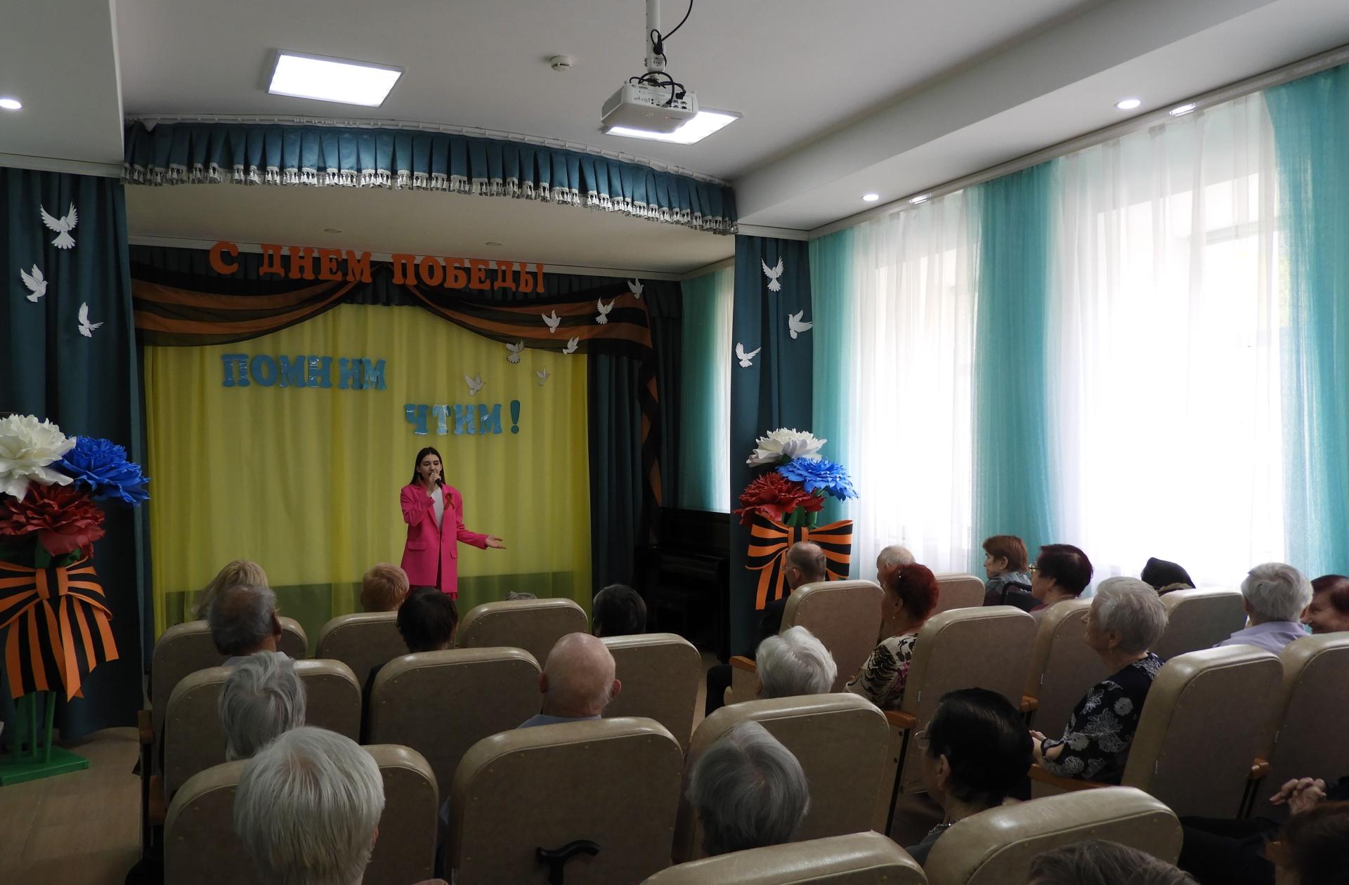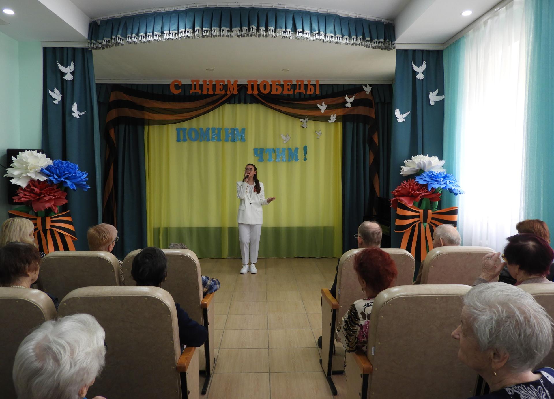 На празднике, посвящённом Великой Победе присутствовали жители Пансионата – труженики тыла, дети войны. Торжественную часть концерта открыла заведующий социально-реабилитационным отделением Е. Е. Самойлова. Пожелав всем здоровья, долголетия и мирного неба, сцена была предоставлена гостям – Центру дополнительного образования для детей, который подарил ветеранам замечательный концерт «Да здравствует Победа!». В ходе концертной программы были исполнены танцы, звучали стихи и всеми любимые песни «Огонёк», «Смуглянка», «Солдат молоденький», «Казаки» и др. Зрители с удовольствием подпевали. Трепетным моментом стала минута молчания, которой почтили светлую память павших. В завершении всем присутствующим ветеранам вручили памятные сувениры и цветы. Закончилось мероприятие традиционной песней «День Победы», которую вдохновенно исполняли все вместе.