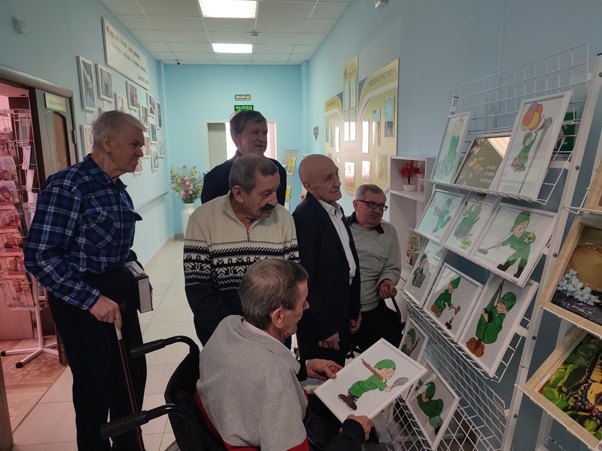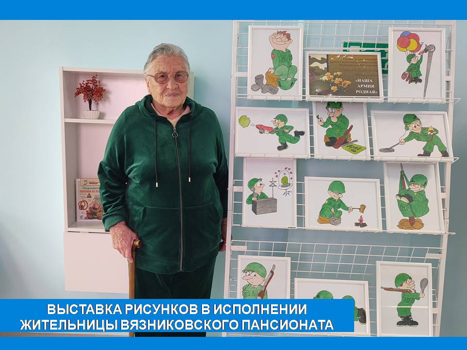 Надежда Фёдоровна Голова оригинальным способом решила поздравить с 23 февраля сильную половину жителей Пансионата. В свои 89 лет она не теряет чувство юмора и с позитивом смотрит на жизнь. Из юмористических зарисовок в её исполнении собралась целая выставка «Наша армия родная», приуроченная ко Дню защитника Отечества.