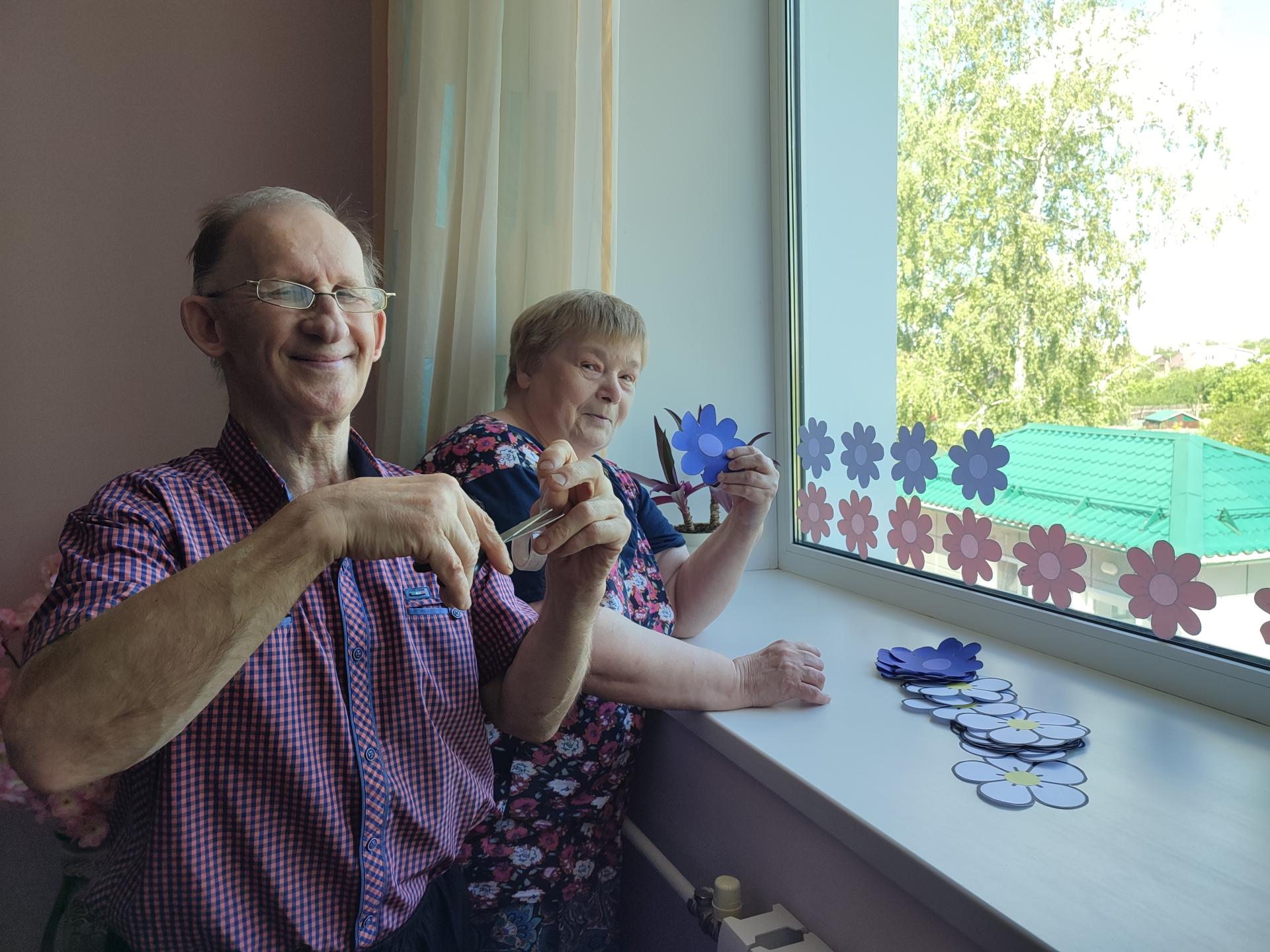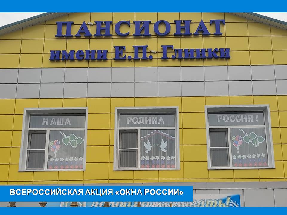 Жители пансионата - яркий пример патриотизма для подрастающего поколения. Они никогда не обходят стороной Всероссийскую акцию «Окна России» и украшают окна своего дома тематической символикой. В этом году было решено показать великие просторы России – лужайка цветов в цвете триколора и берёзовая веточка.