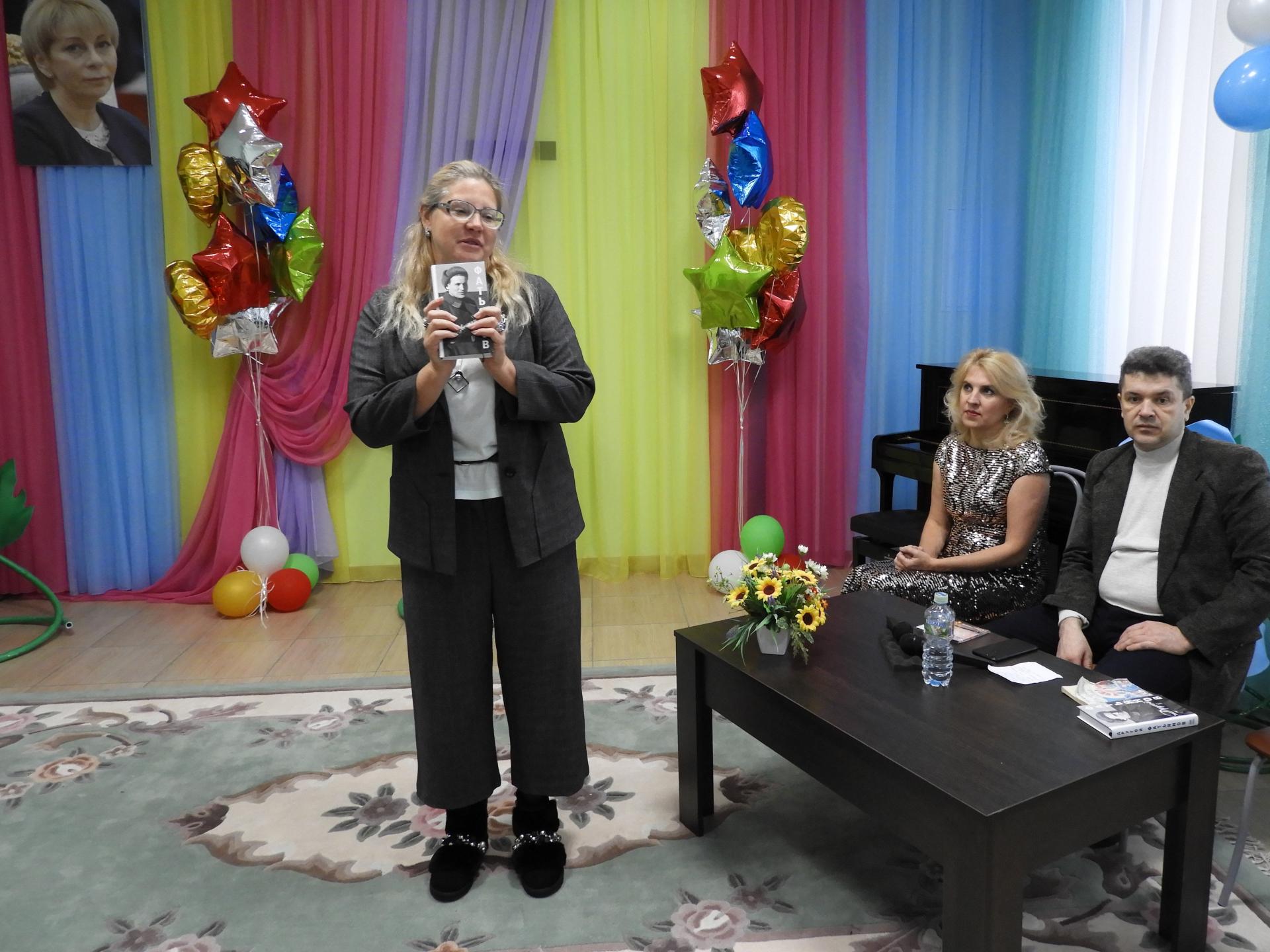 16 декабря в Вязниковском Пансионате состоялась интересная музыкально-поэтическая встреча, посвящённая закрытию Года Фатьянова в Вязниках. Жители Пансионата были очень рады новой встрече с внучкой поэта Анной Фатьяновой-Китиной, а также знакомству с внуком композитора Бориса Мокроусова – Максимом Мокроусовым. На этой встрече Анна презентовала новую книгу «Неизвестный Фатьянов», она читала стихи, которые нельзя прочесть ни в одном другом сборнике. И, конечно, эта книга пополнила библиотечный фонд Пансионата, а Максим Мокроусов подарил диск с песнями своего знаменитого дедушки «На Волге широкой».