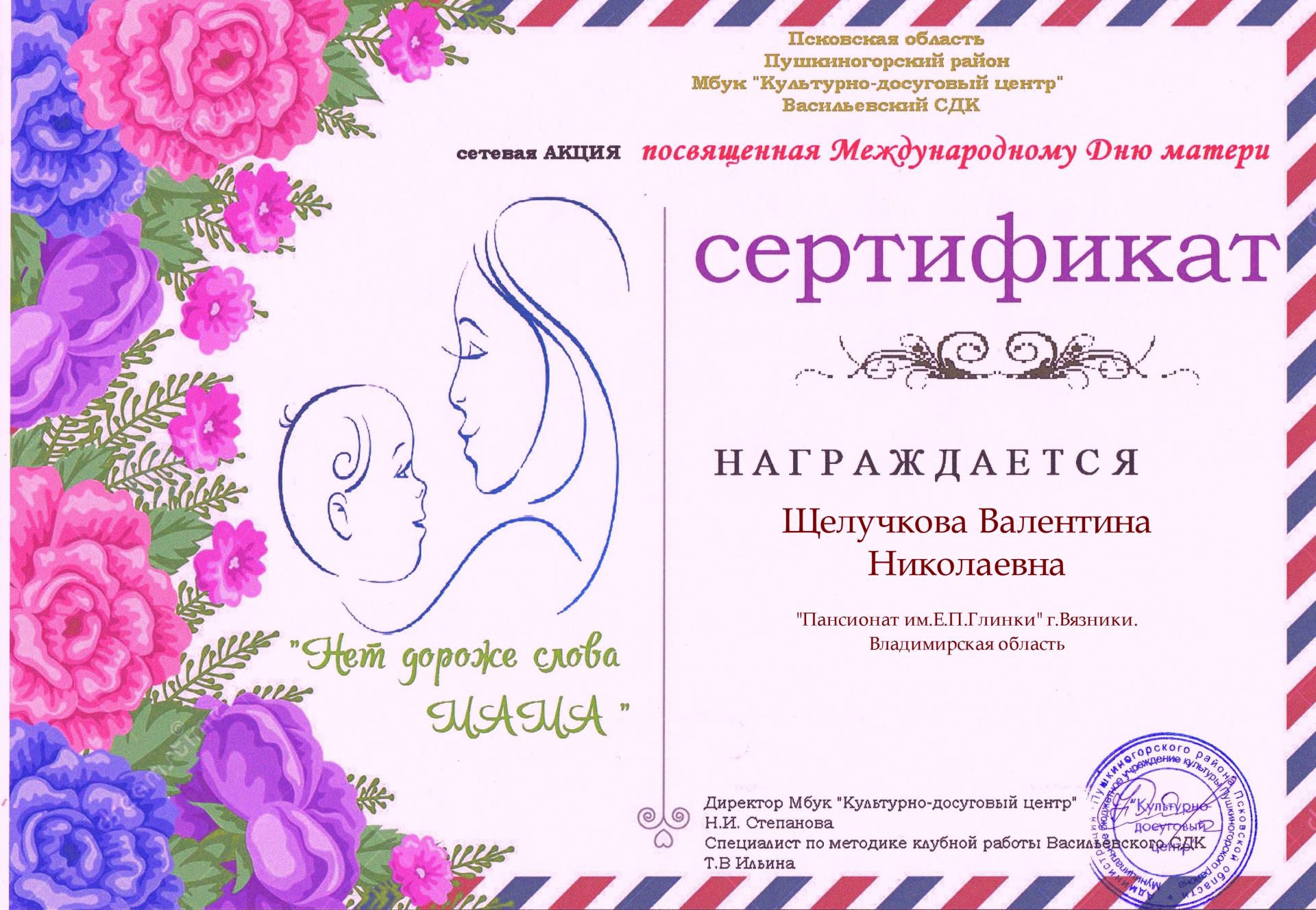 Вязниковский Пансионат с удовольствием принимает участие в сетевой акции "Нет дороже слова МАМА!", посвящённой Дню матери, организатором которой является Васильевский СДК Пушкиногоpского района Псковской области. В исполнении жительницы Пансионата Валентины Щелучковой звучит стихотворение Андрея Дементьева «Мамины руки».