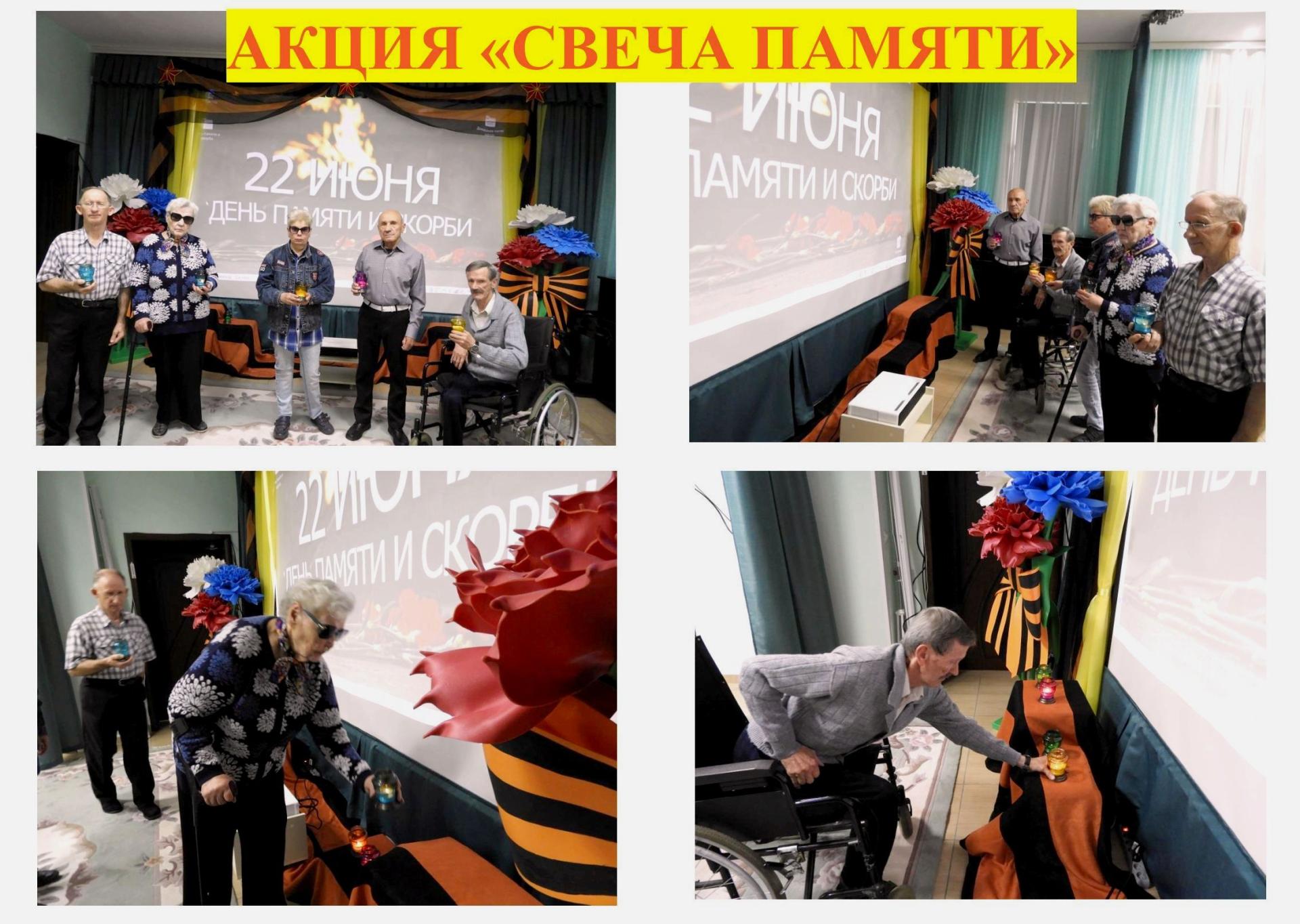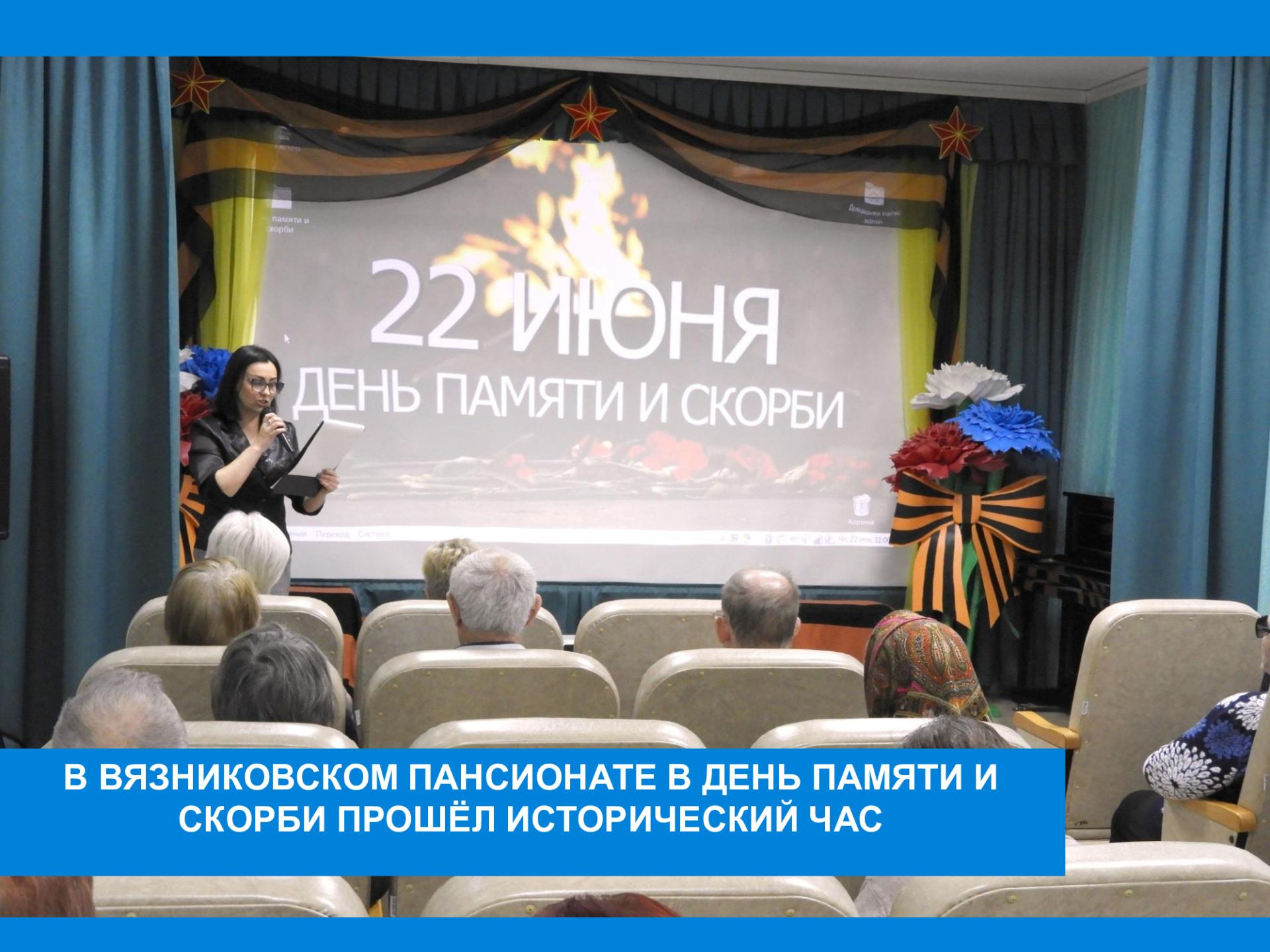 22 июня в России отмечается День памяти и скорби. В этот день жители Вязниковского Пансионата отдали дань памяти всем погибшим в Великой Отечественной войне. На историческом часе «Никто не забыт, ничто не забыто!» звучали стихи, демонстрировались видеоматериалы. Присутствующие на мероприятии, символично присоединяясь к акции «Свеча памяти», зажгли свечи и почтили память погибших минутой молчания. Пока жива память об этом событии, пока жива в наших сердцах благодарность тем, кто отстоял честь, свободу и независимость нашей Родины, наше государство будет независимым, а народ – непобедим.