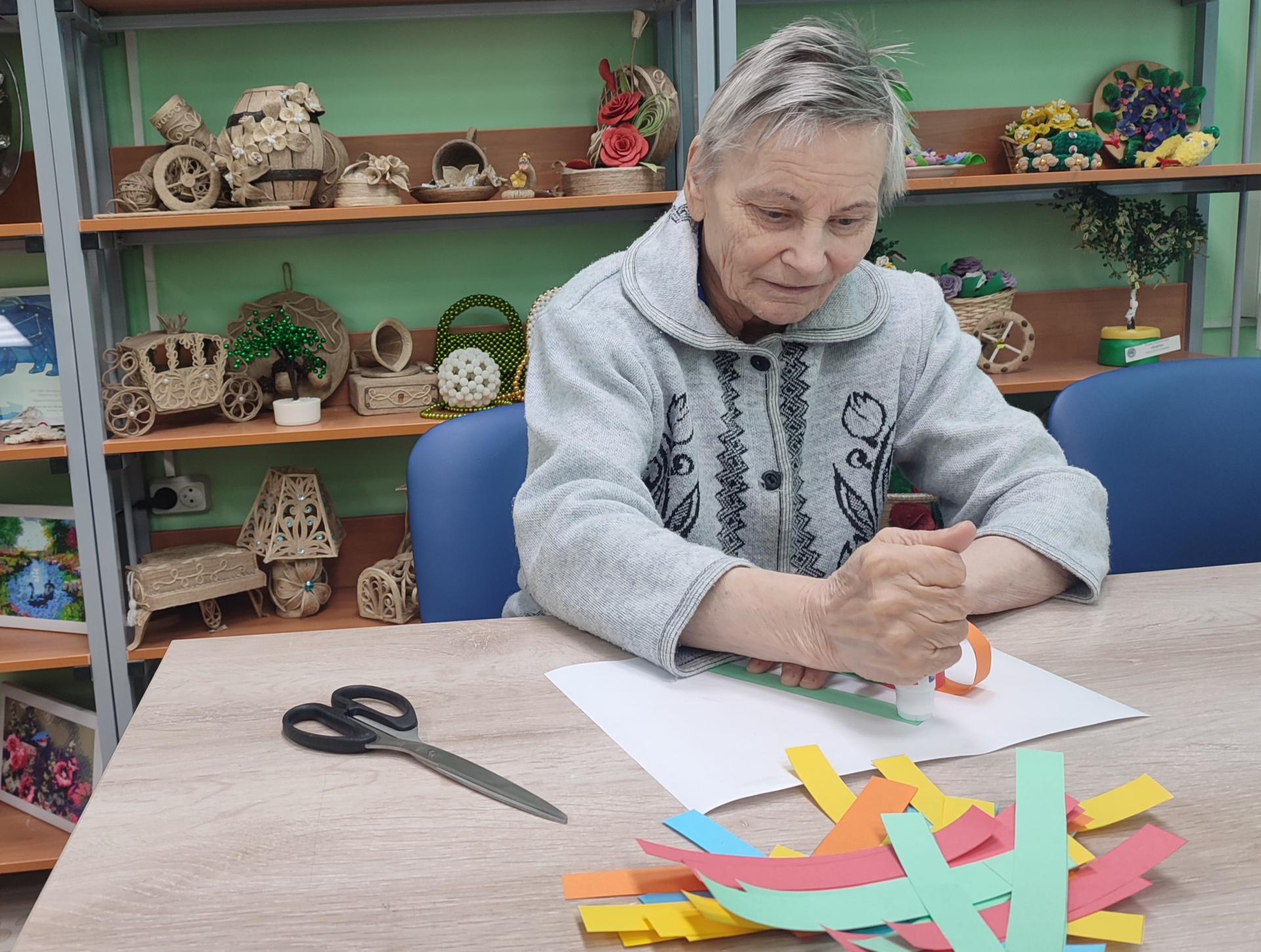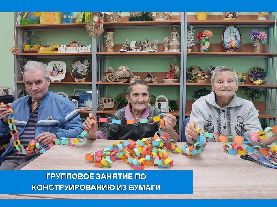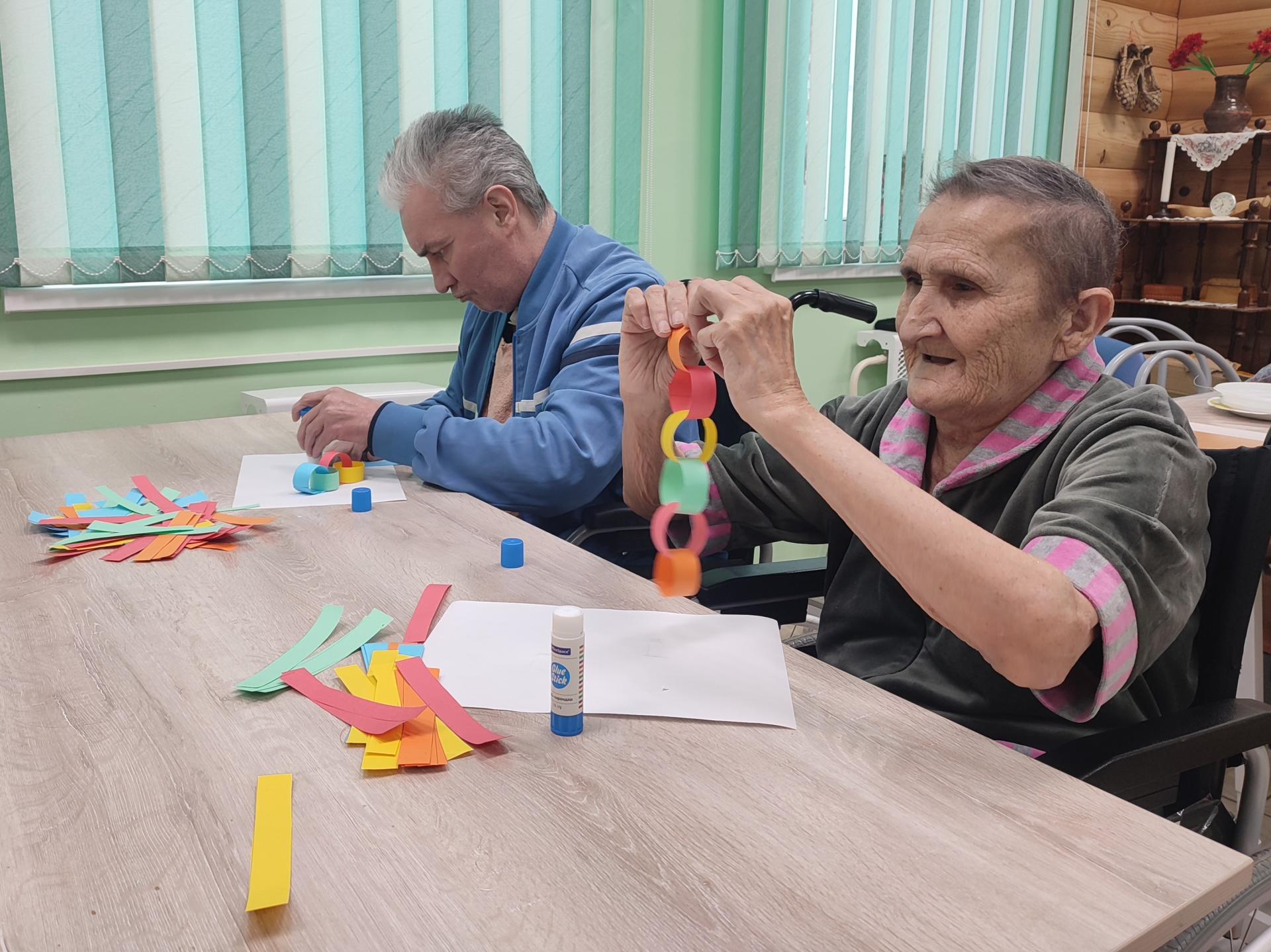 На занятии по конструированию из бумаги маломобильные жители Пансионата изготовили гирлянду «цепочку» из цветных полосок. Ловко создавая колечко за колечком, они делились друг с другом своими интересными новогодними историями. Помимо хороших эмоций такое времяпрепровождение ещё тренирует мелкую моторику рук и когнитивные способности.