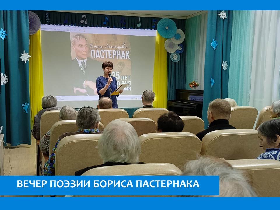 15 февраля в пансионате прошёл вечер-портрет: «Борис Леонидович Пастернак: судьба и творчество». Участники мероприятия познакомились с биографией и литературной деятельностью писателя. На вечере читали стихи, звучали песни и отрывки из переводов: «Свеча горела», «Ёлка», «Рождественская звезда», «Быть знаменитым не красиво», «Снег идёт» и др.