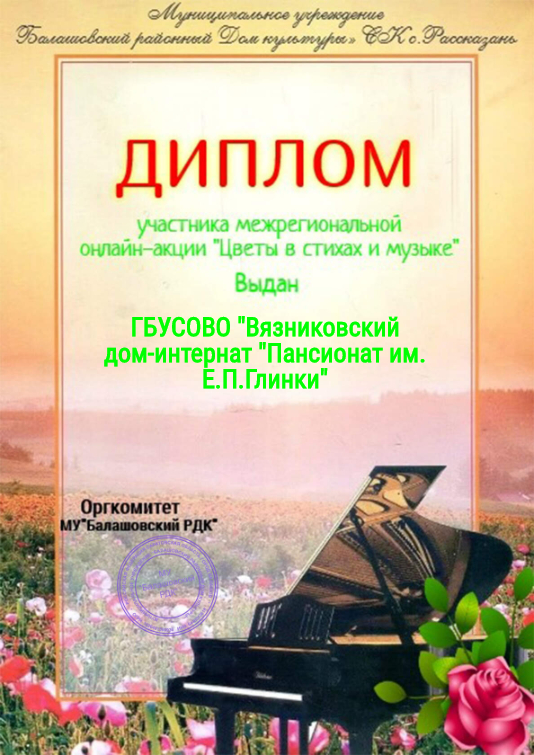 МУ «Балашовский РДК» организовал сетевую акцию «Цветы в стихах и музыке», в которой с удовольствием приняли участие жители Вязниковского Пансионата. Благодарим организаторов за такую приятную и вдохновенную акцию!