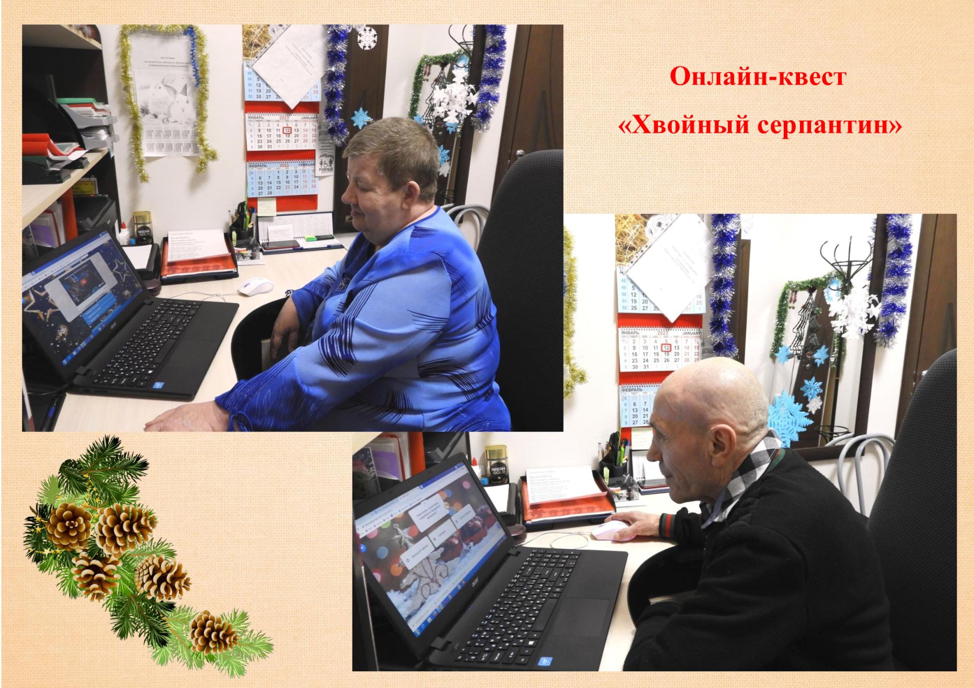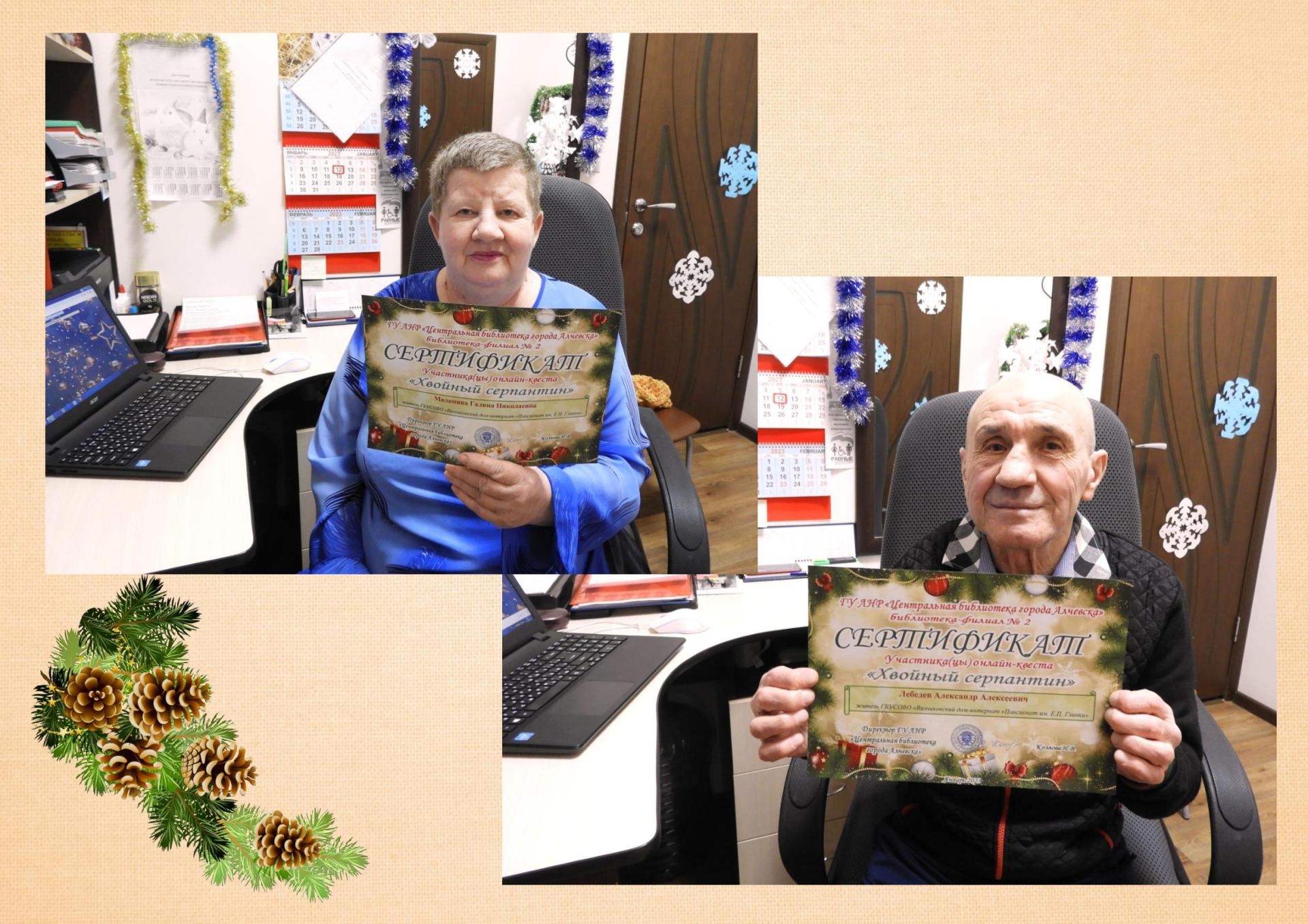 Г.Н. Малинина и А.А. Лебедев – постоянные участники онлайн-игр и викторин. На этот раз они прошли онлайн-квест «Хвойный серпантин», организованный Центральной библиотекой г. Алчевска (Луганская Народная Республика), в котором нужно было ответить на весёлые вопросы викторины, припомнить прекрасные стихи о зиме великих поэтов и вставить пропущенные слова, насладиться отрывками любимых новогодних фильмов и ответить на вопросы по ним.